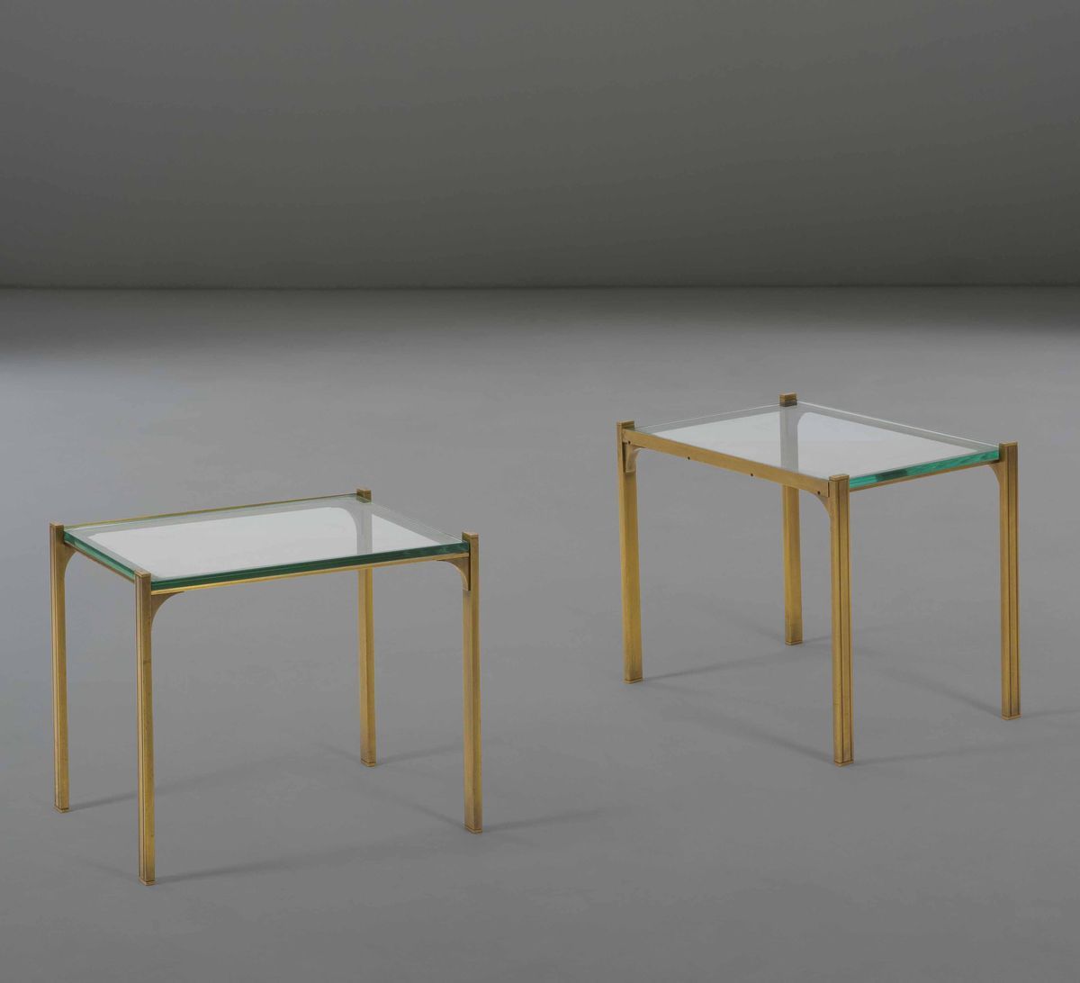 Coppia di tavoli bassi con struttura in ottone e piano in cristallo molato.