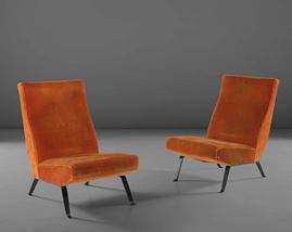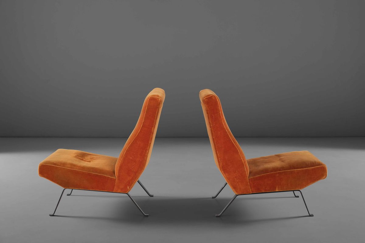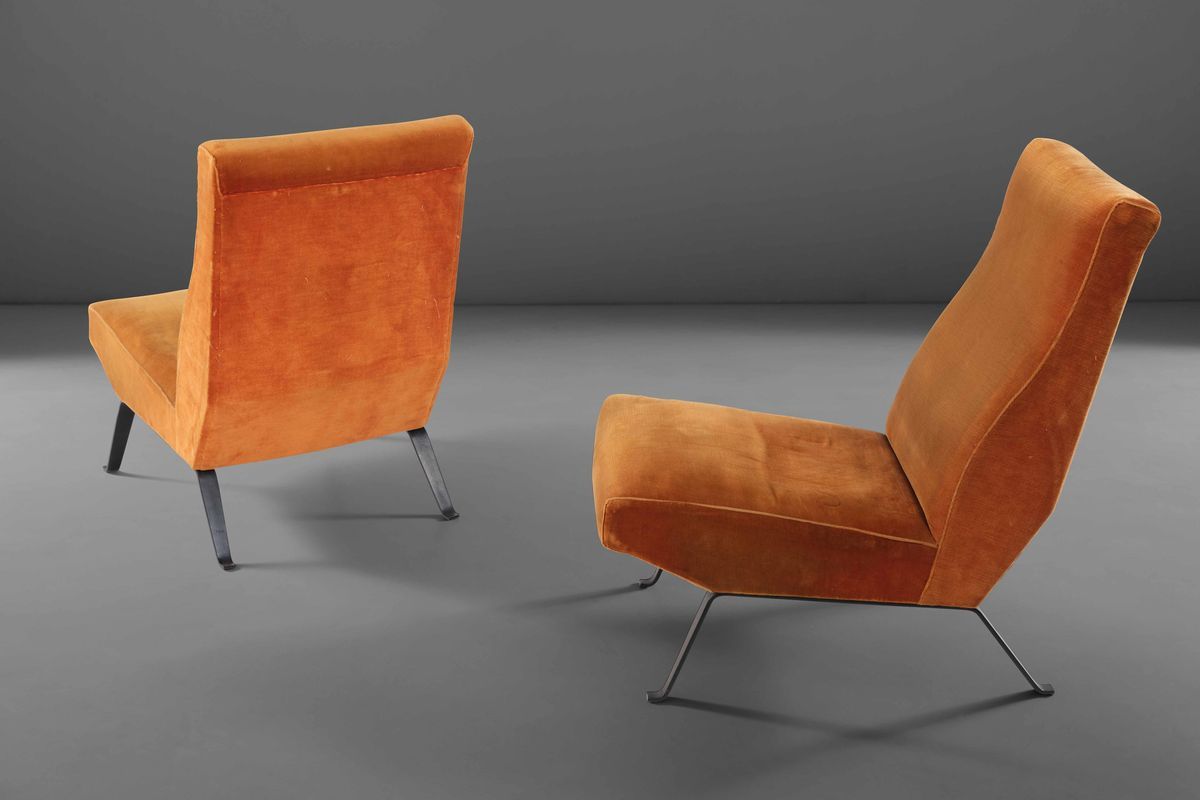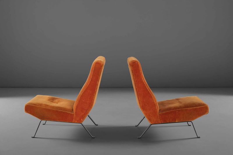 Due poltrone con sostegno in metallo laccato e rivestimenti in tessuto.