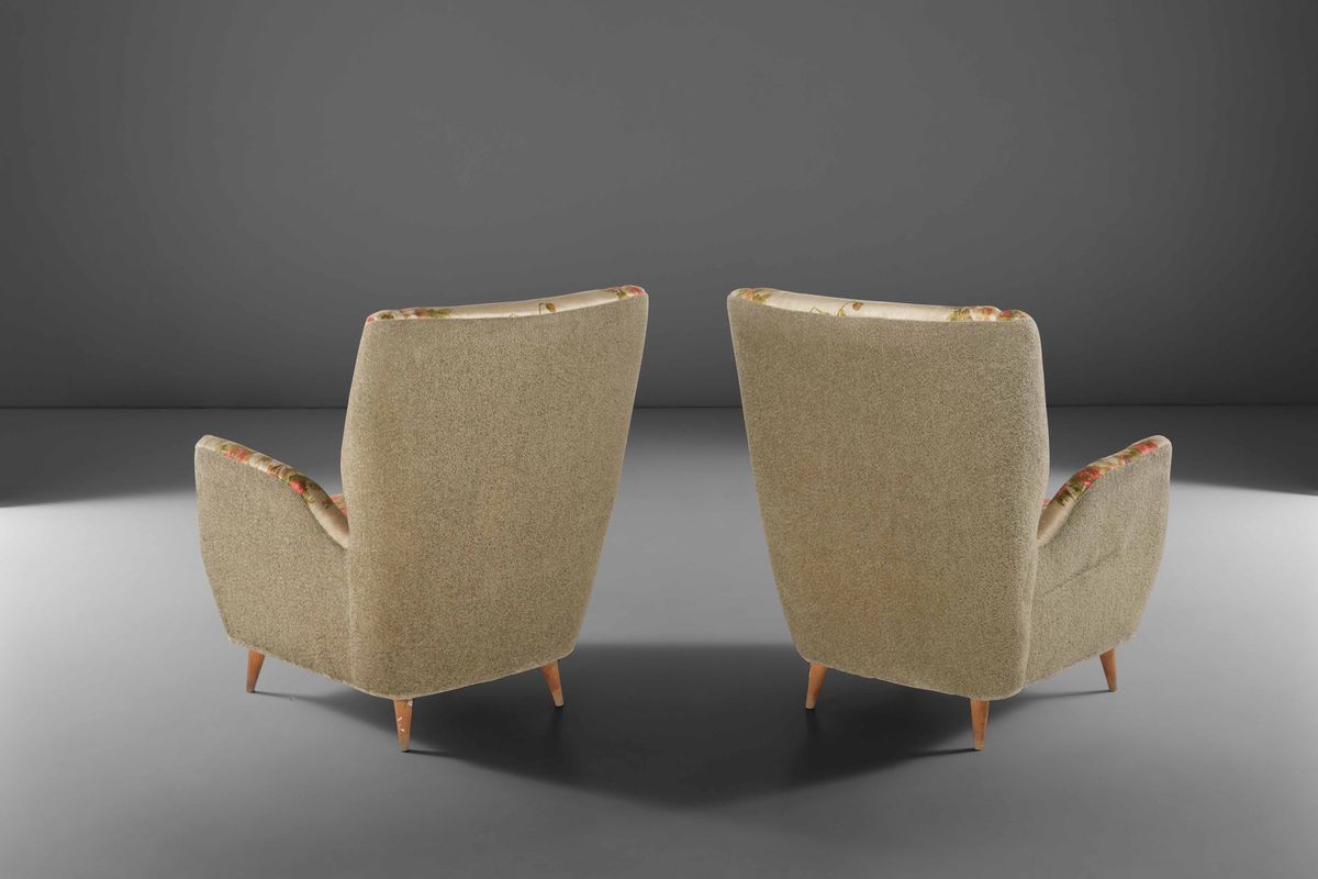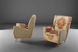 Due poltrone con struttura in legno e rivestimenti in tessuto.