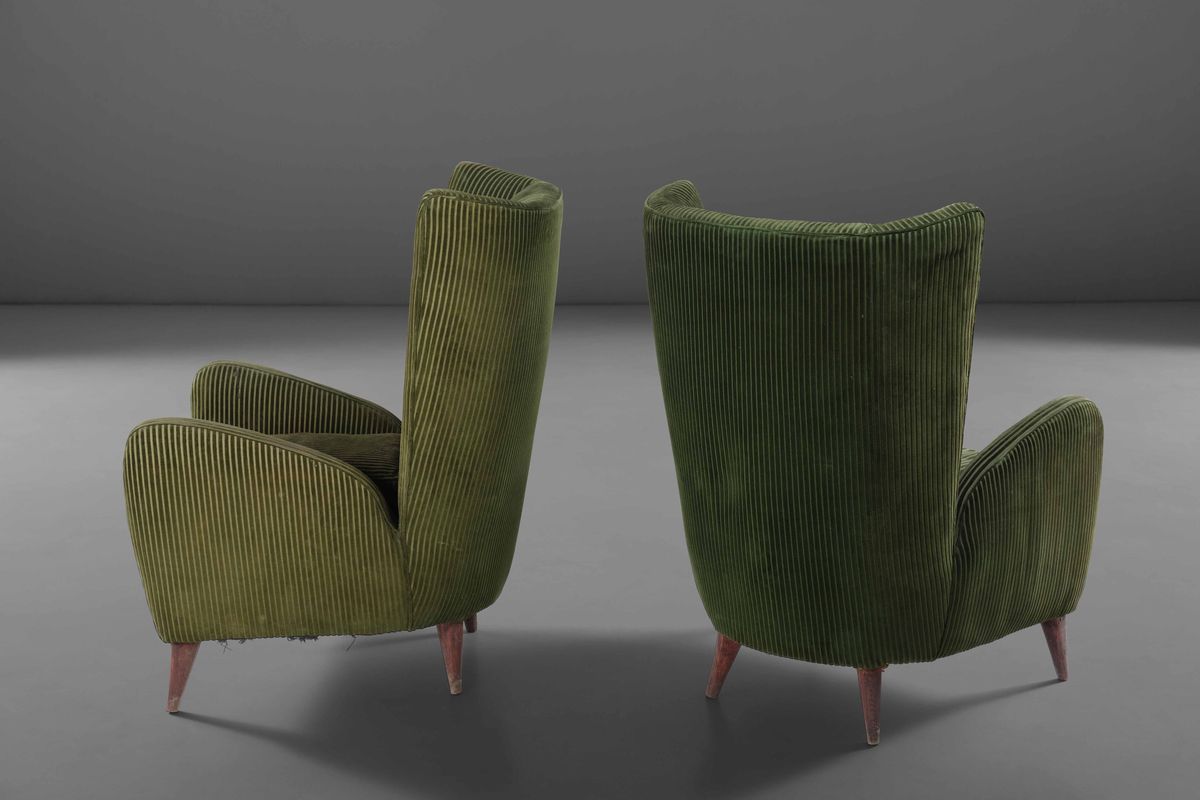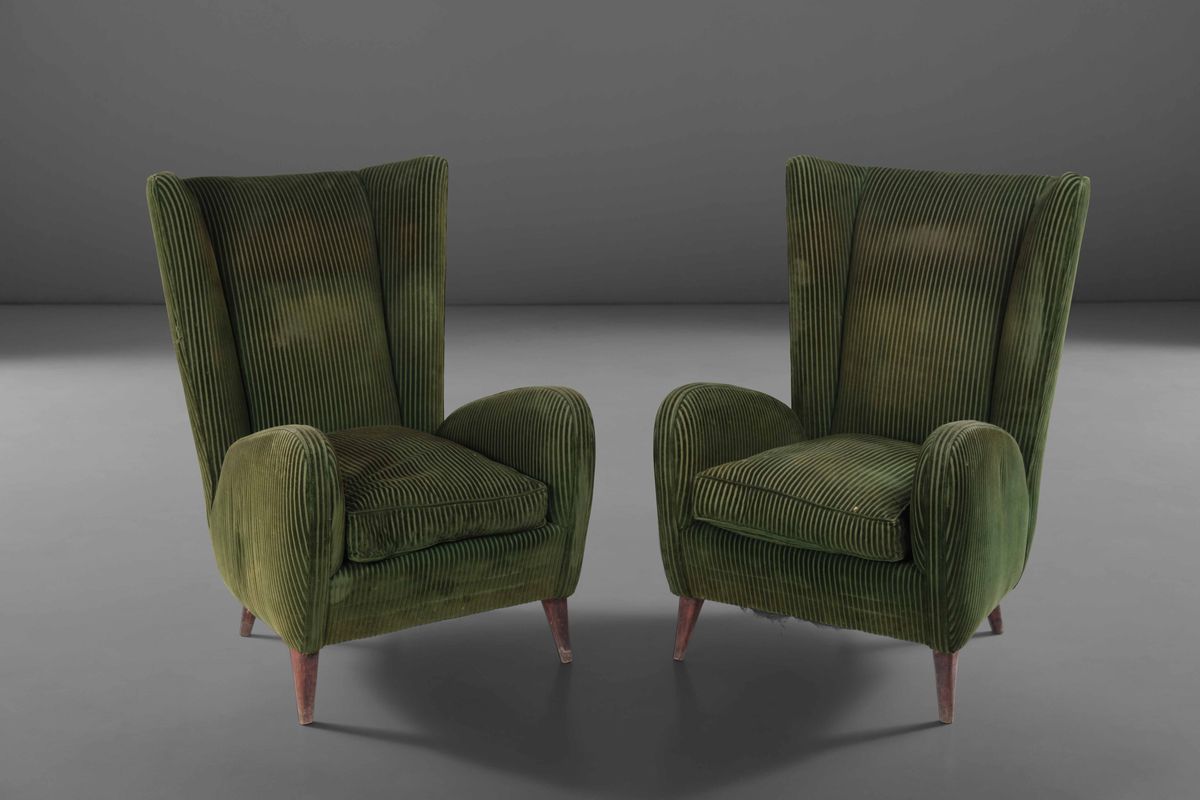 Due poltrone con struttura in legno e rivestimenti in velluto.