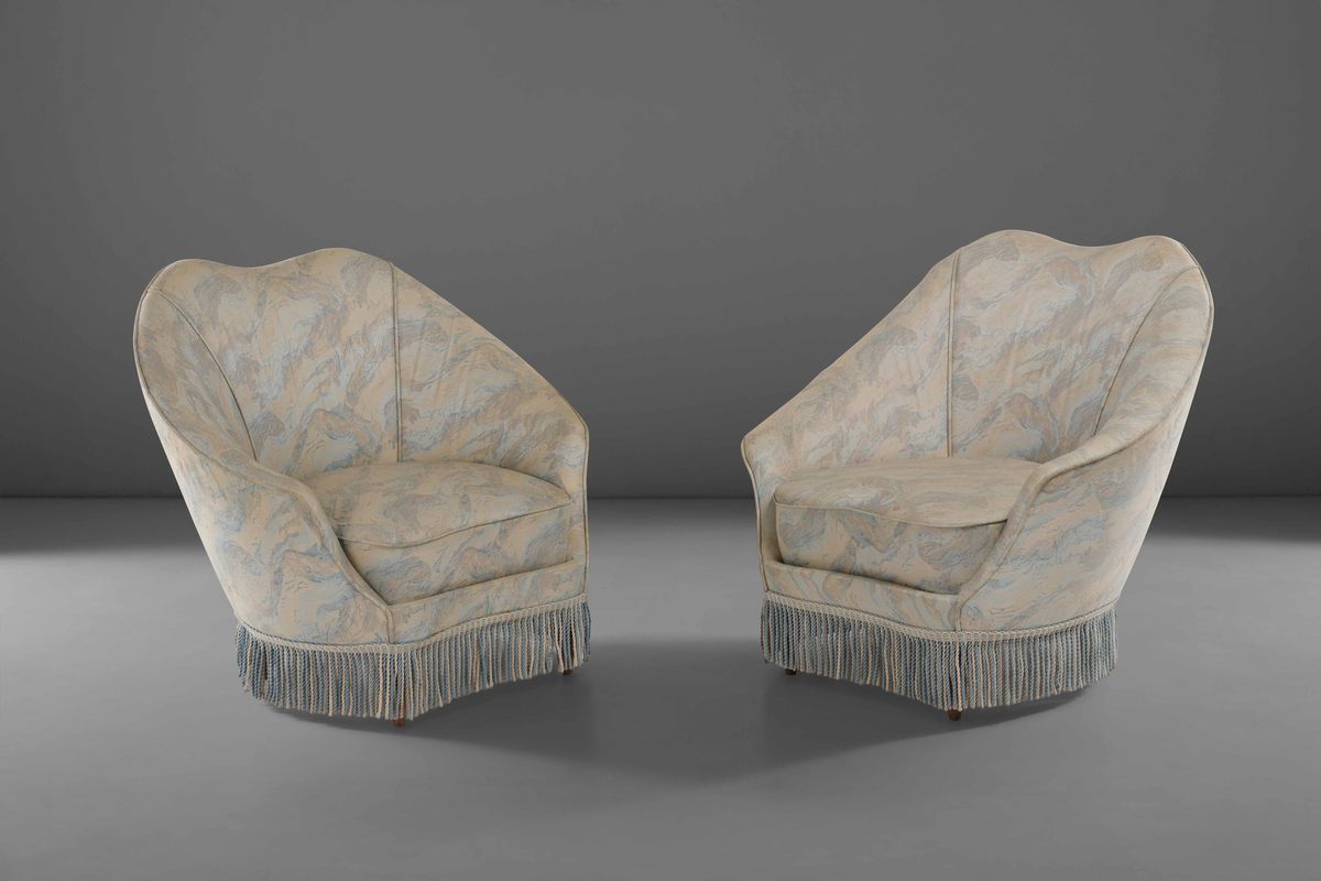 Coppia di poltrone con struttura in legno e rivestimenti in tessuto e passamaneria.