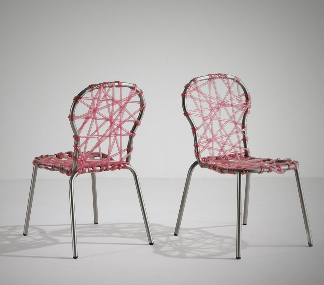 Coppia di poltrone con struttura in metallo tubolare e seduta in materiale plastico intrecciato.