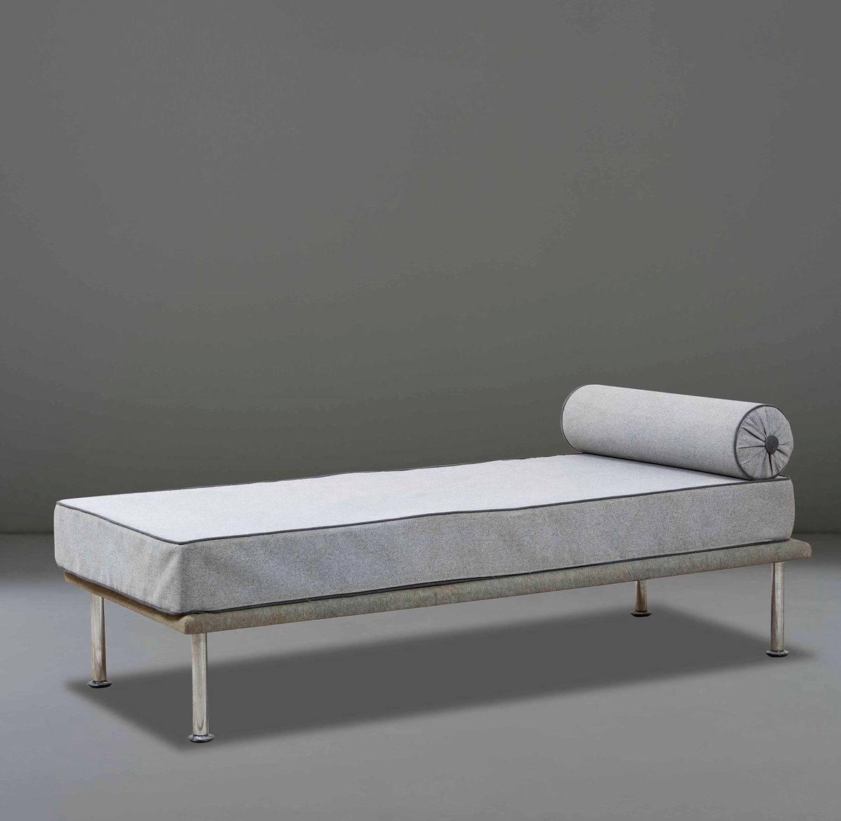 Daybed con struttura in metallo cromato e rivestimenti in tessuto. Disegno originale per centro residenziale Talponia a Ivrea.