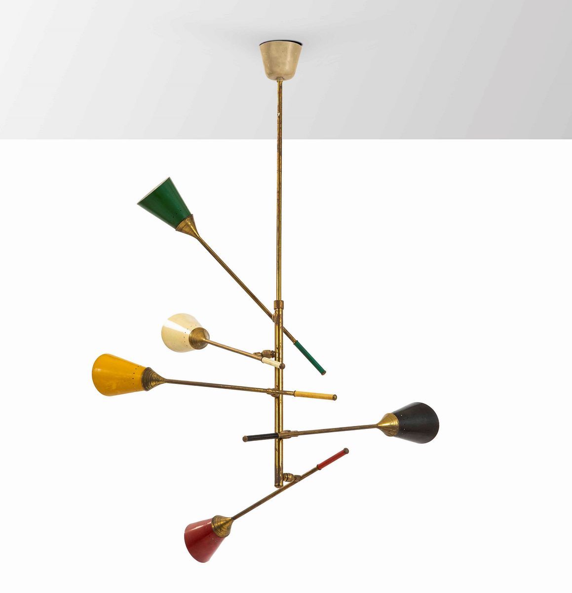 Lampada a sospensione con struttura in ottone e diffusori orientabili in metallo laccato.