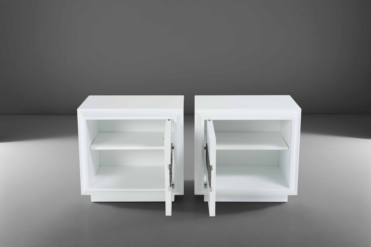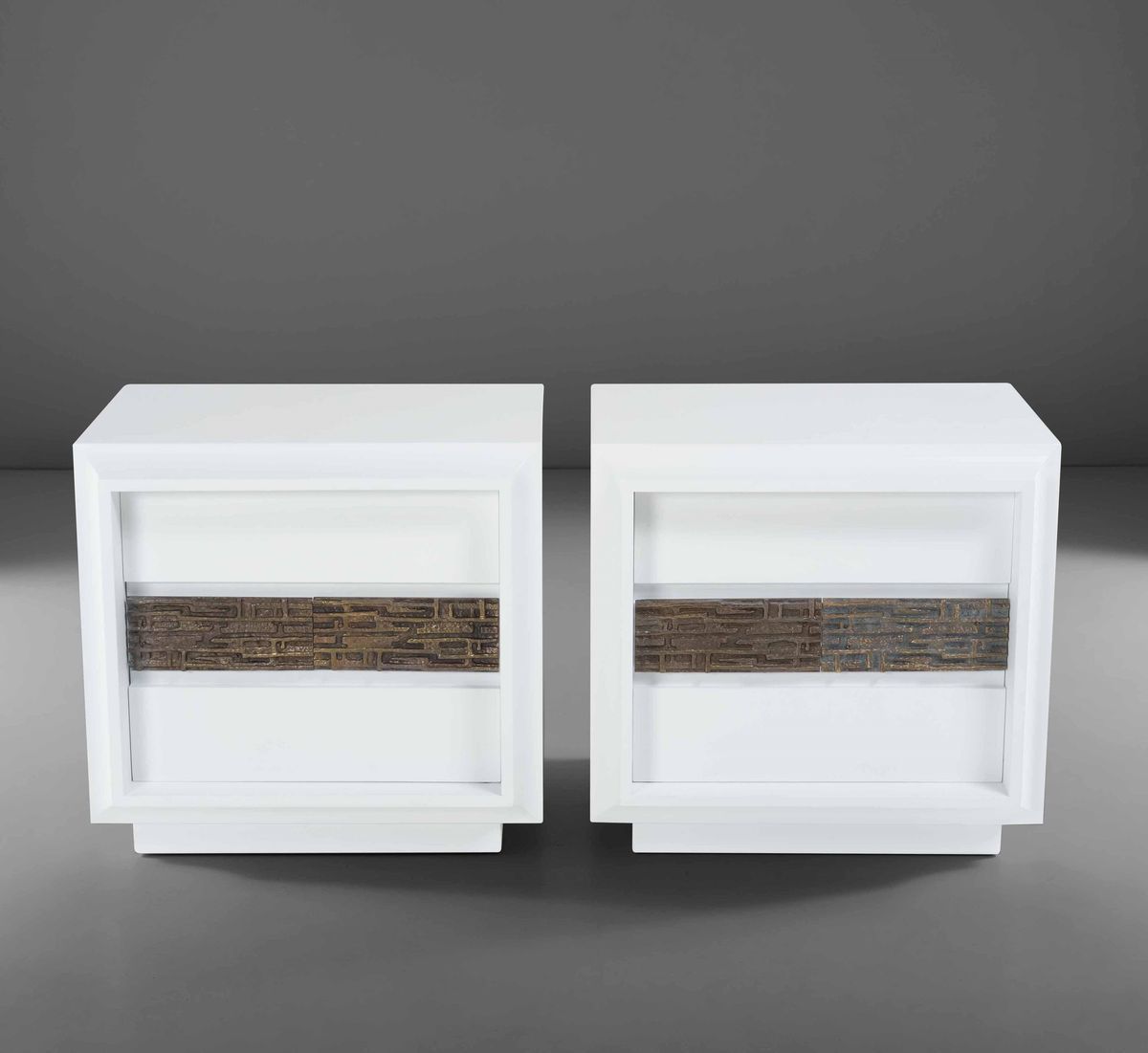 Coppia di comodini della serie Desiree con struttura in legno laccato e inserto in bronzo lavorato.