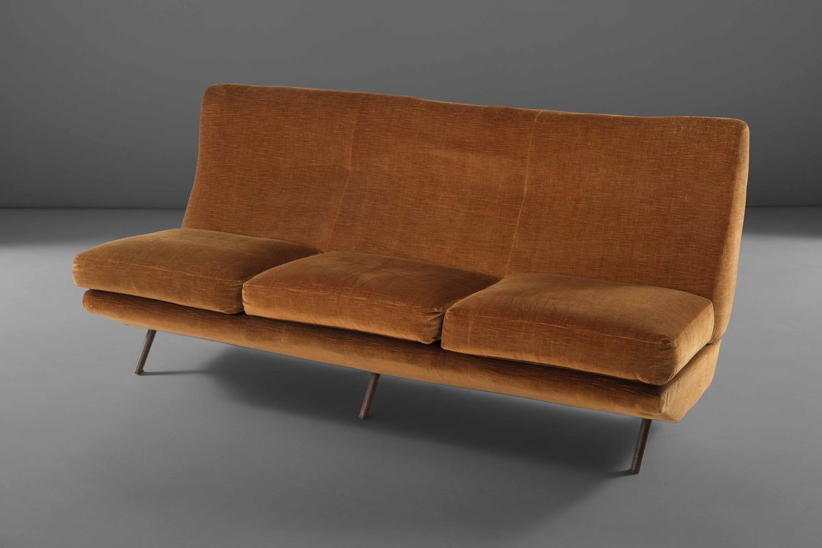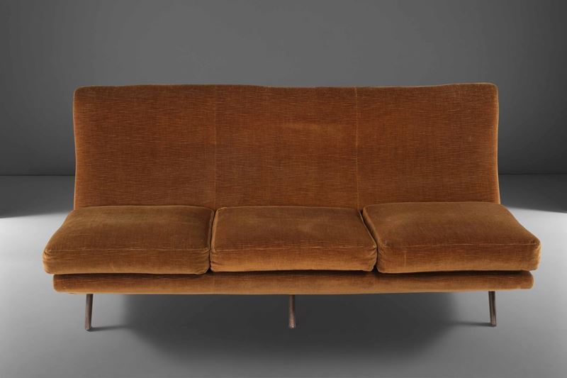 Divano IX Triennale con struttura in legno e metallo, sostegni in ottone e rivestimenti in tessuto.