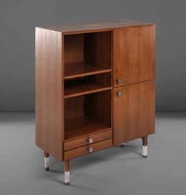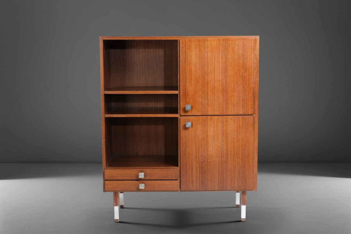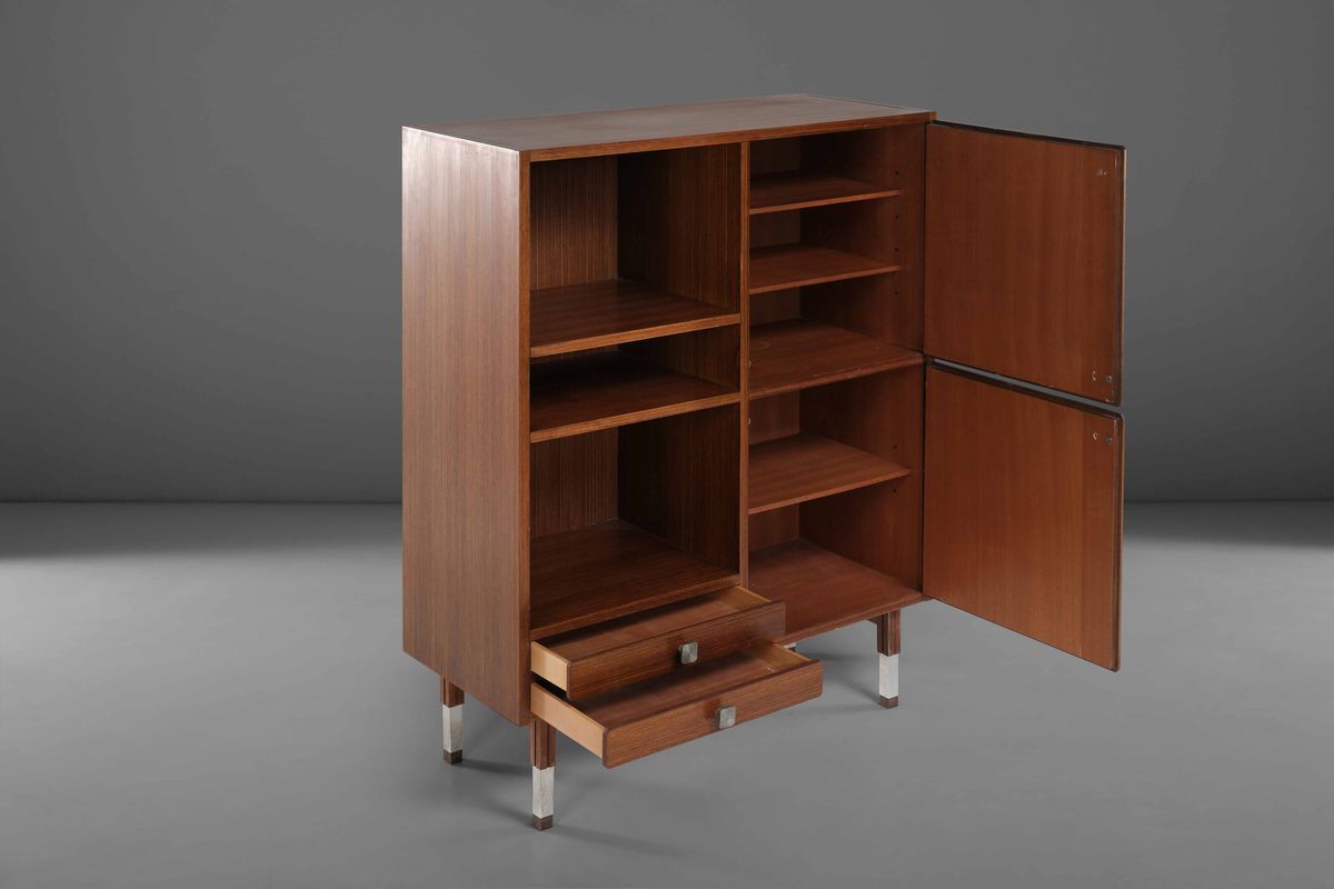 Mobile contenitore con struttura in legno e dettagli in acciaio.