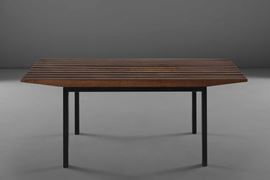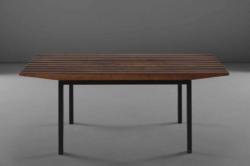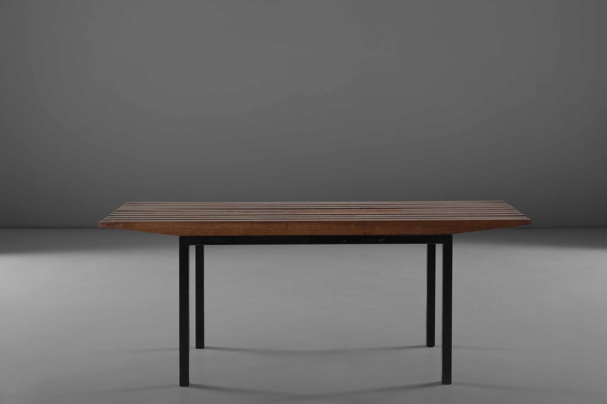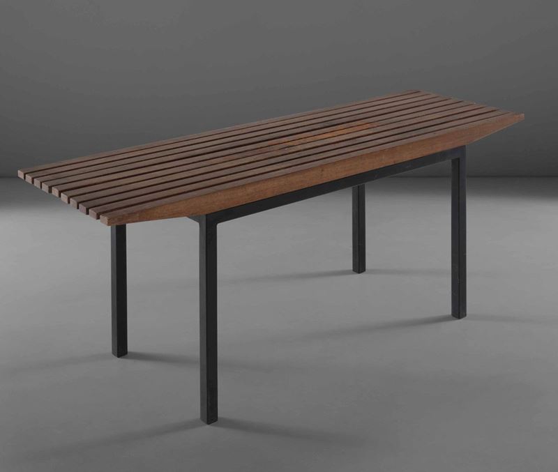 Panca con piano in legno a listelli e struttura in metallo laccato.