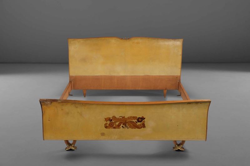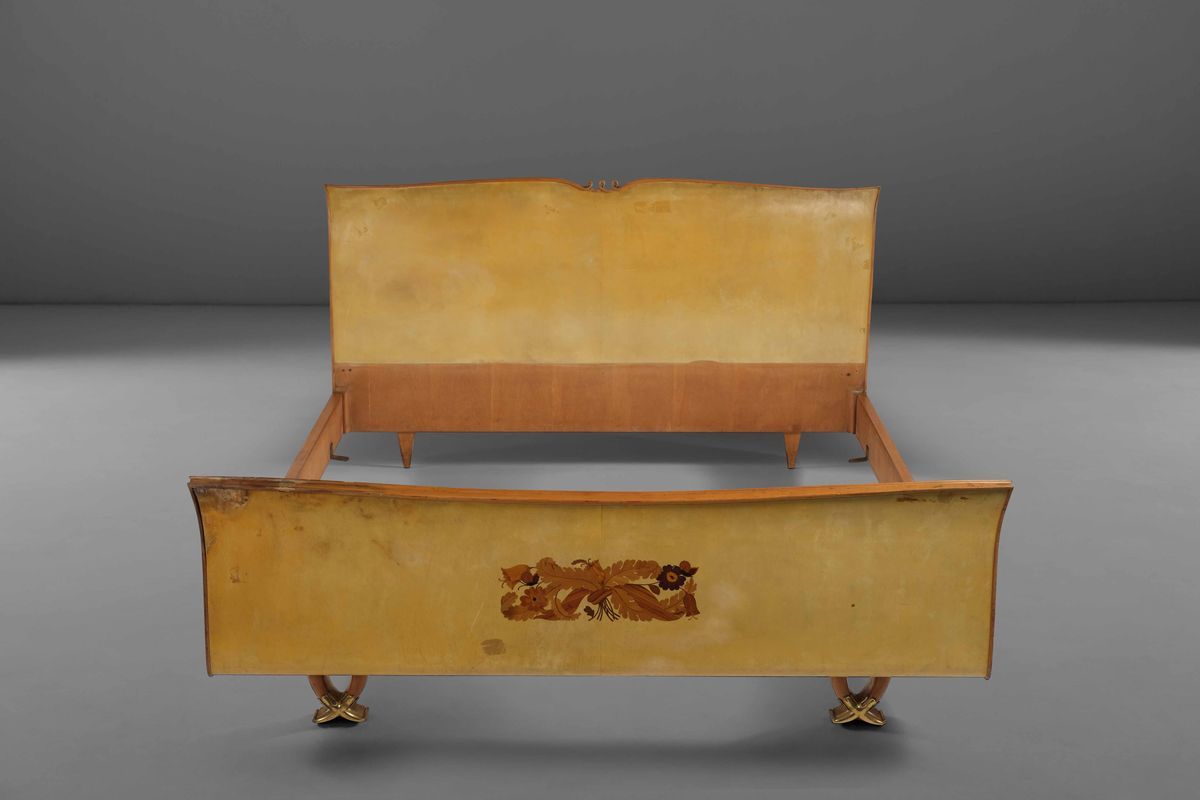 Letto matrimoniale con struttura in legno, sostegni in ottone e rivestimenti in pergamena.