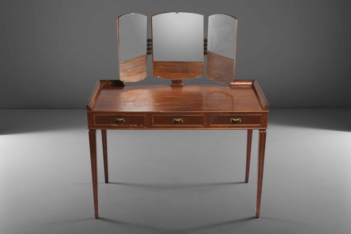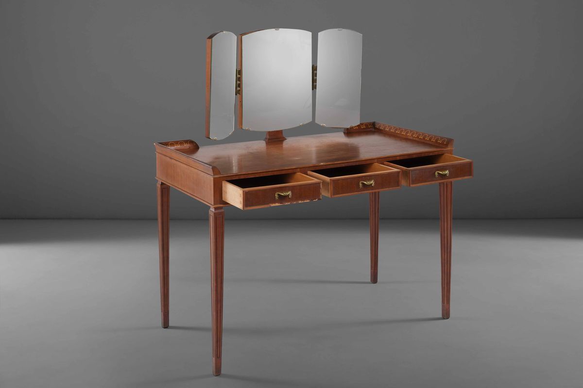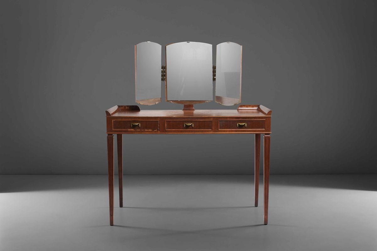 Toilette con specchiera mobile in vetro. Struttura in legno con inserti e dettagli in ottone.