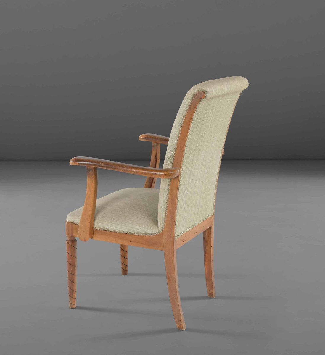 Poltrona con struttura in legno e legno lavorato. Rivestimenti in tessuto.