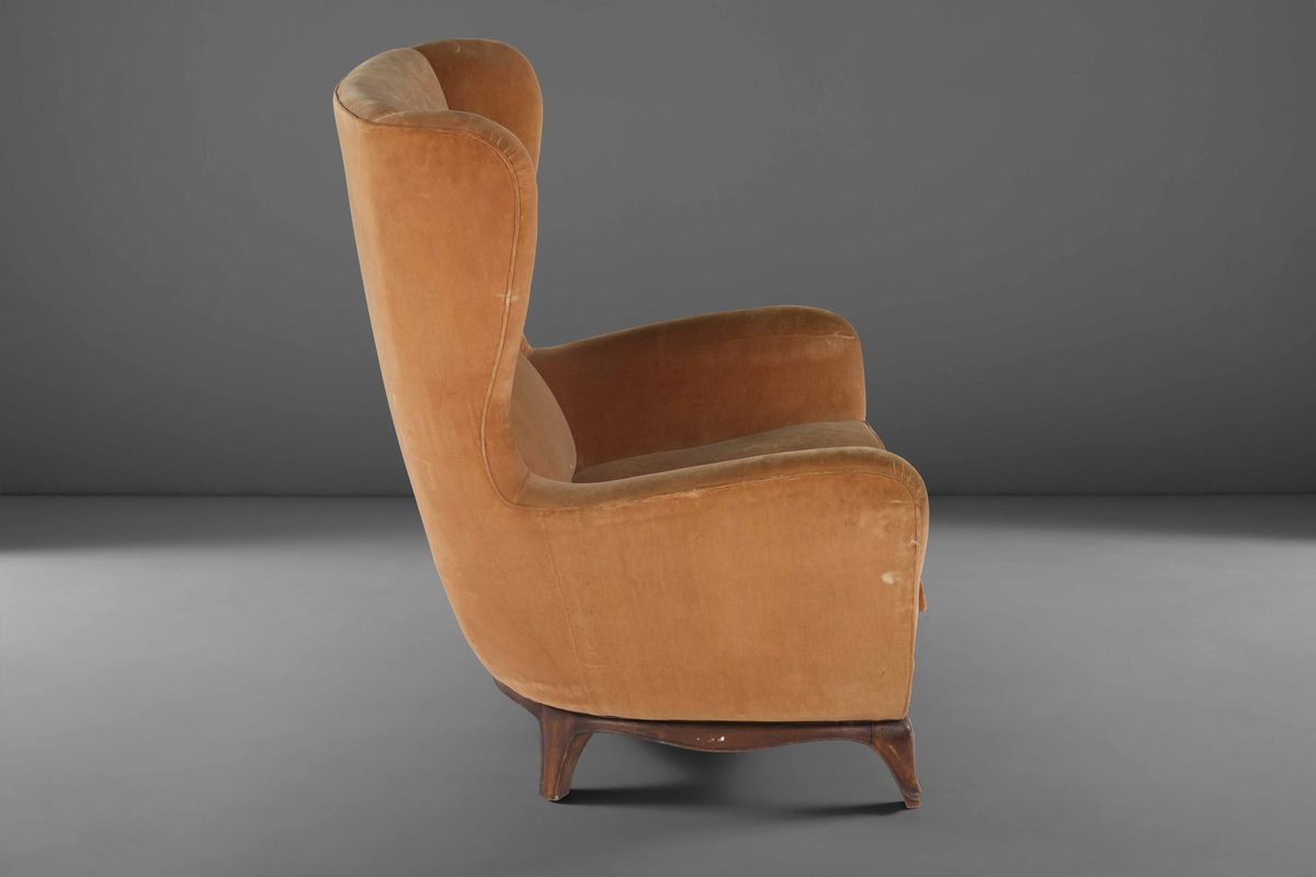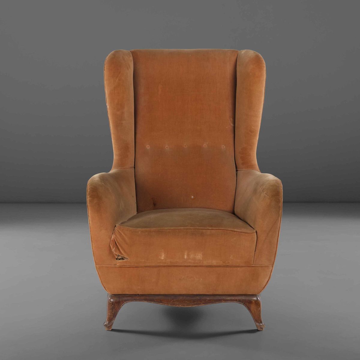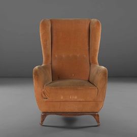 Poltrona con struttura in legno e rivestimenti in tessuto.