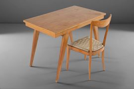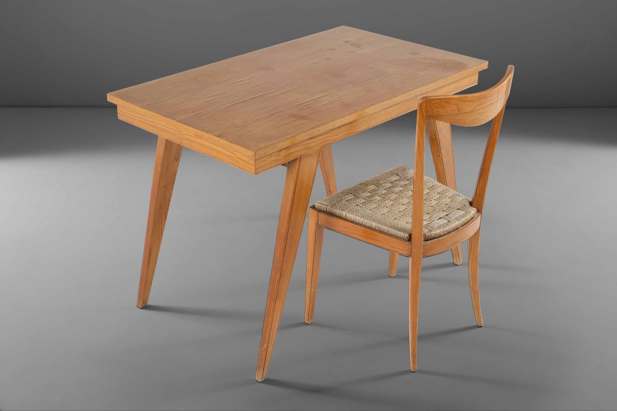 Scrivania con struttura in legno e sedia in legno con seduta in corda.