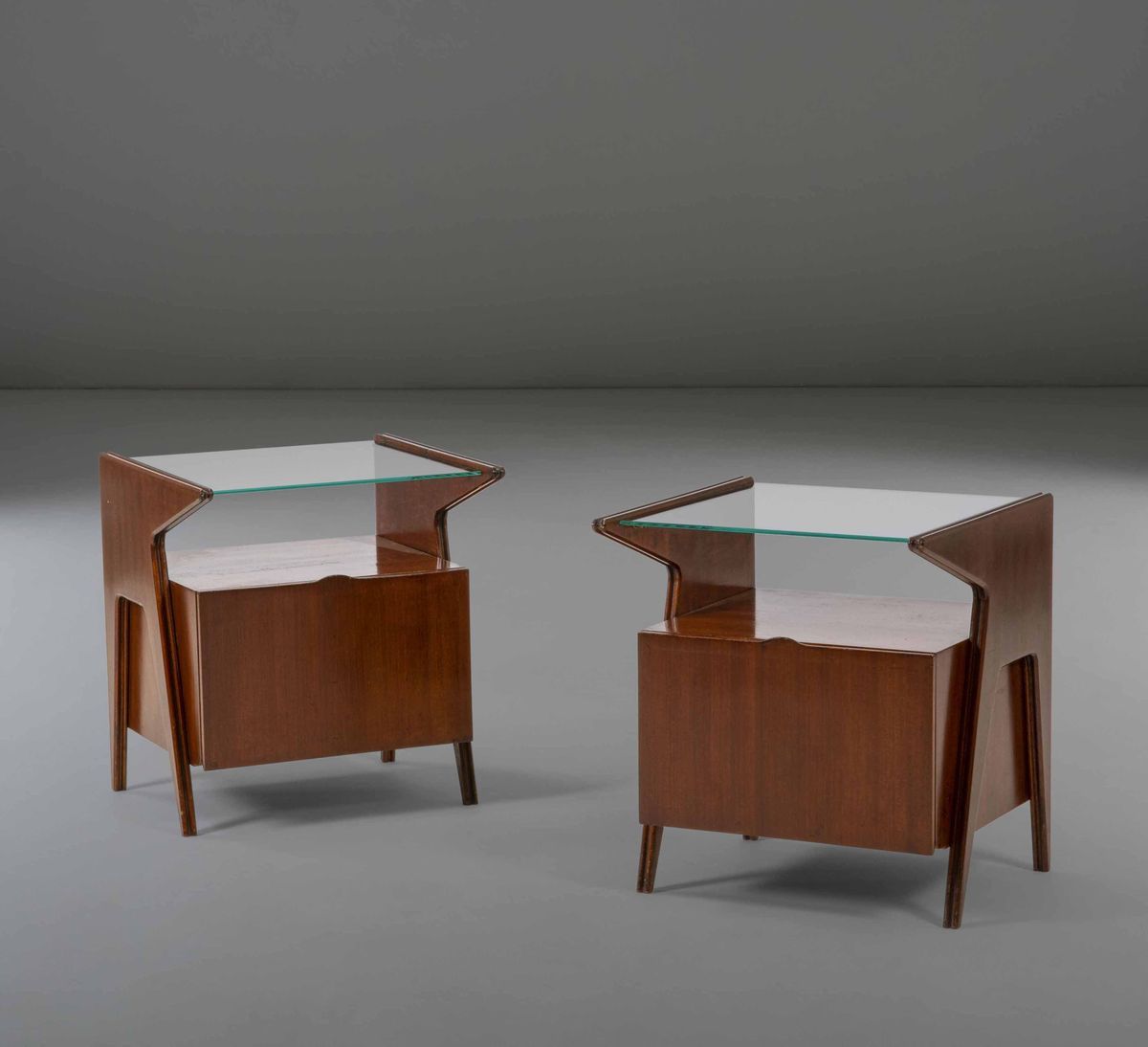 Coppia di comodini con struttura e sostegni in legno, piano in cristallo molato.