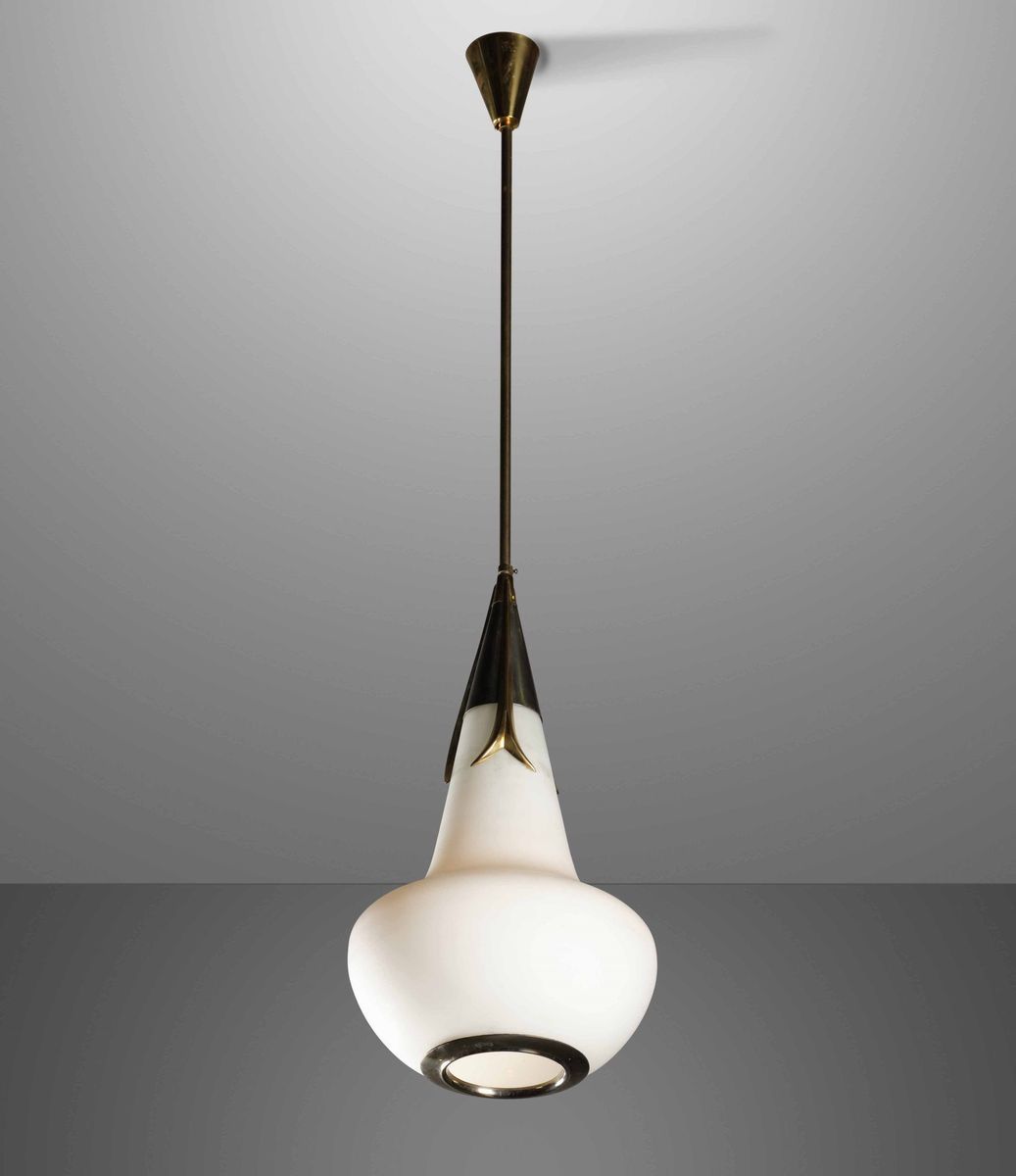 Lampada a sospensione con struttura in ottone e diffusore in vetro opalino e vetro molato.