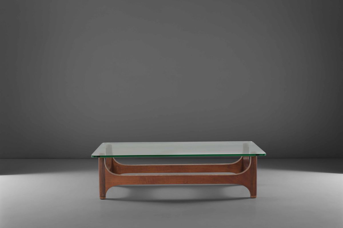 Tavolo basso con base in legno e piano con cristallo molato di forte spessore.