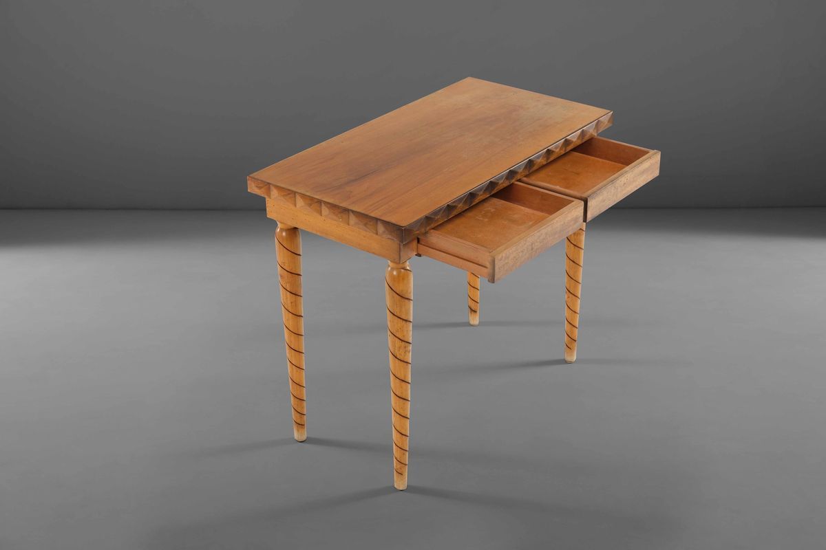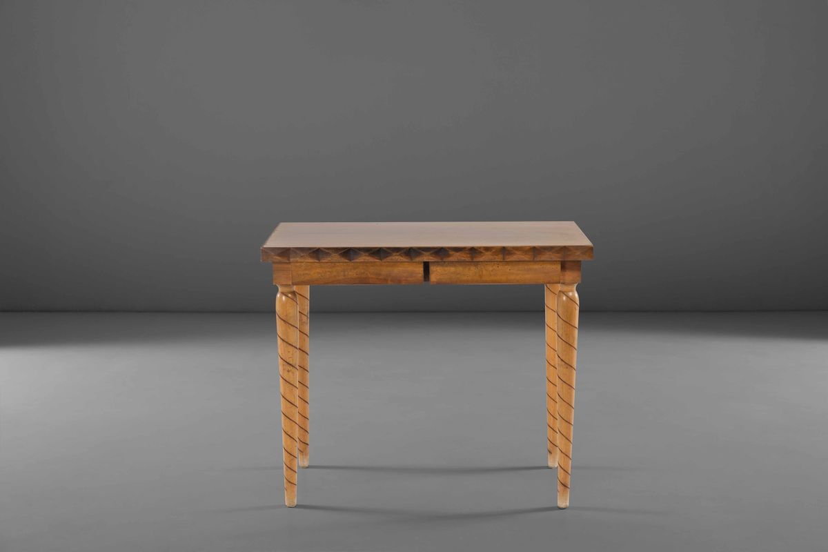 Tavolo con struttura in legno e legno lavorato.