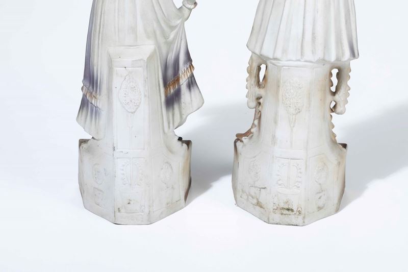 Porcellana biscuit policroma. Marca: assente. Altezza cm 37. Conservazione: la figurina femminile con testa rincollata, mano sinistra restaurata; mano destra della figura maschile restaurato