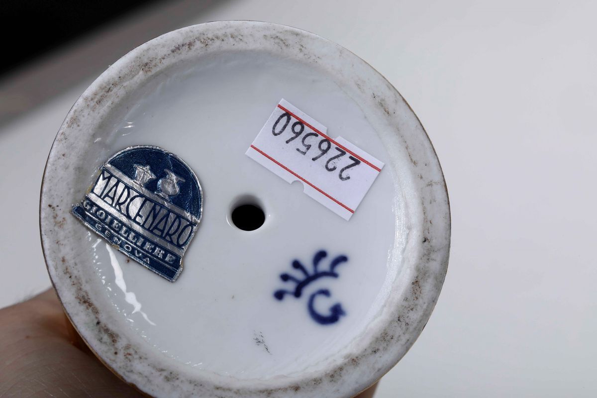 Porcellana bianca e oro. Marca: “G” con corona; “N” con corona “Made in Italy” in blu. Altezza cm 25,8; cm 21,2. Conservazione: la figura con la cornucopia è priva della mano destra e di un dito della mano sinistra.