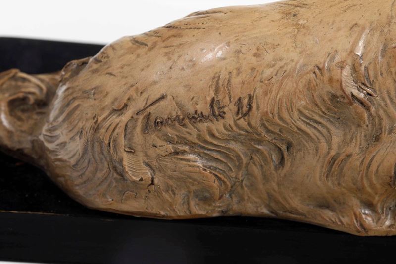 Terracotta smaltata. Marca: firma non decifrabile. Altezza cm 18; cm 31,5x15. Conservazione: zampe anteriori rincollate