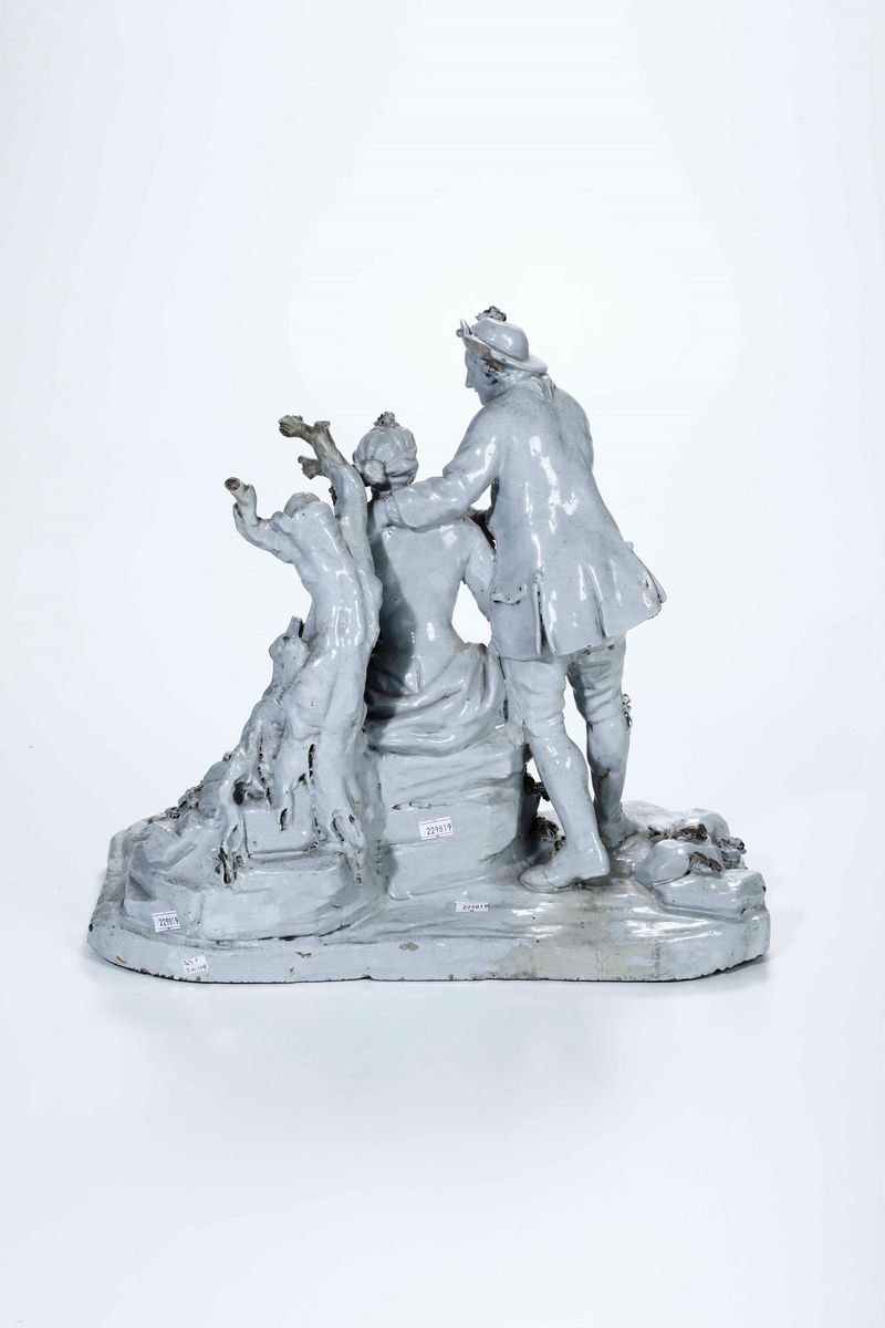 Maiolica bianca. Marca: assente. Altezza cm 41,5; cm 44x25. Conservazione: base con diverse felature di cottura ricoperte in vecchi restauri; il personaggio maschile con mano destra rincollata e sbeccature e restauri alla tesa del cappello; il personaggio femminile con avambraccio destro rincollato, pollice mano destra mancante, alluce piede sinistro rincollato e restauro per felatura di cottura al piede destro; mancanze e restauri minori alla vegetazione