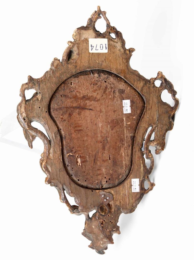 Acquasantiera a specchio Legno scolpito e dorato Inserti in vetro verde fuso Manifattura veneziana, probabile XVIII seco [..]