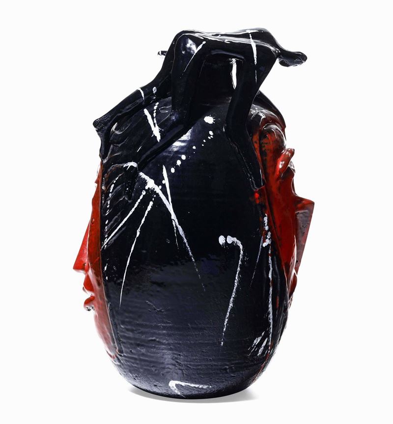 Vaso in maiolica policroma con volto muliebre sul fronte ed ansa antropomorfa.