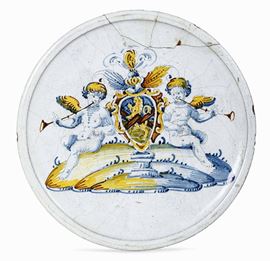 Alzata tonda, con piano disteso e orlo liscio, su base ad anello, in maiolica decorata con due putti alati che, suonando la tromba, presentano uno scudo stemmato con leone rampante, cimiero e cornice accartocciata. Tutto poggia su un’ampia zolla erbosa