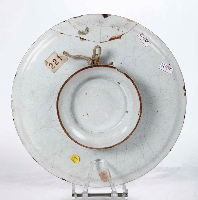 Maiolica decorata con colori a gran fuoco. Dimensioni: altezza cm 5; diametro cm 26. Conservazione: rottura rincollata al bordo; minime sbeccature