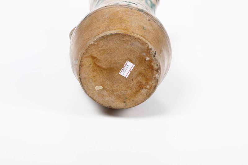 Maiolica arcaica decorata in bicromia a gran fuoco. Altezza cm 25. Conservazione: rotture nella parte superiore ricomposte in restauro con qualche integrazione