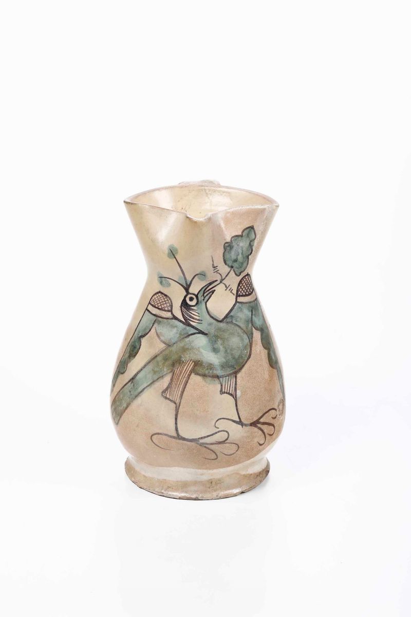 Boccale dal corpo ovoidale, con collo, bocca trilobata (di restauro), larga ansa a nastro e piede a disco. Rivestito con un sottile strato di ingobbio, è decorato con un uccello ad ali spiegate, stilizzato, con foglie disegnato in nero di manganese e colorato in verde ramina