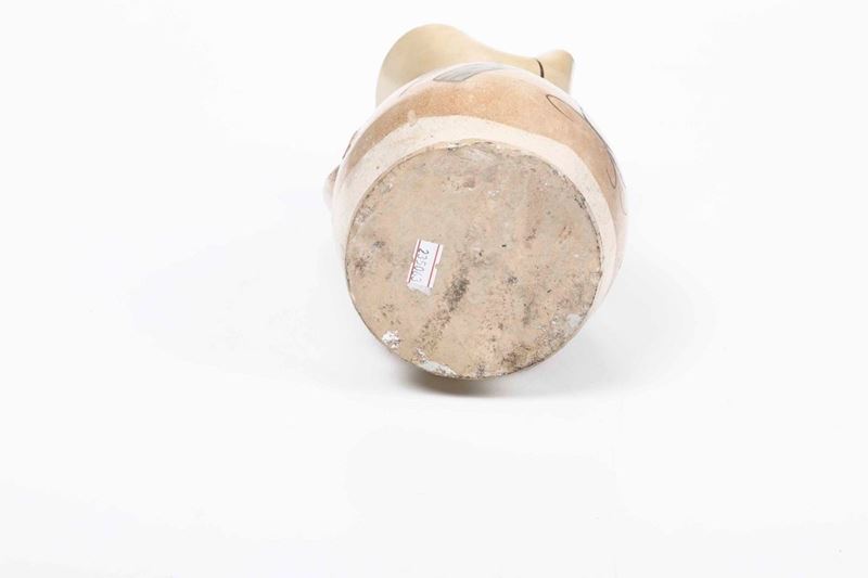 Terracotta ingobbiata e invetriata decorata in bicromia. Altezza cm 21,8. Conservazione: bocca e collo integrati; rottura sulla pancia sotto il beccuccio restaurata