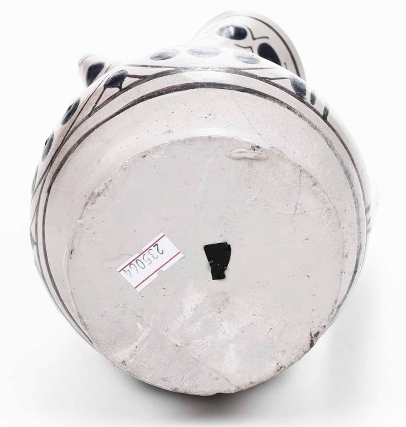 Boccale dal corpo ovoidale, a bocca trilobata con ansa a nastro, in maiolica arcaica, rivestita con smalto povero di stagno. Questo ornato, chiamato “a zaffera in rilievo”, è disegnato in bruno di manganese e colorato in monocromia blu scuro. Vi sono tre motivi decorativi: una sequenza di bottoni sul collo, una fascia di doppie perle sulla spalla e, in basso, foglie di quercia stilizzate