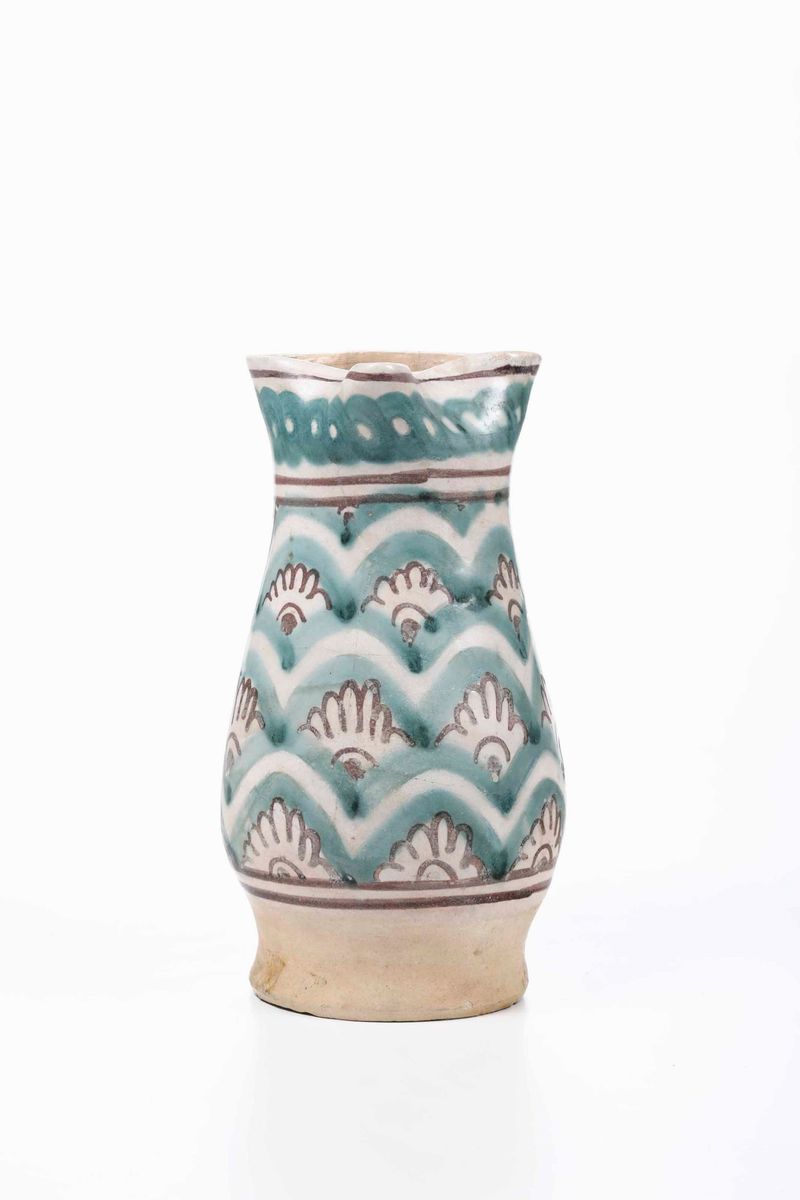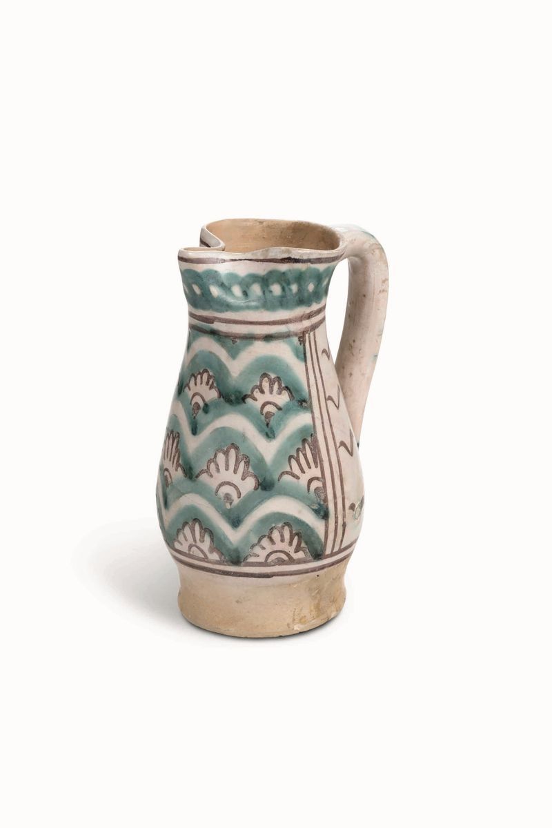 Boccale dal corpo piriforme, su basso piede, con bocca trilobata e ansa a cordolo, esternamente rivestito di smalto stannifero (povero di stagno). Un motivo a squame disegnato in verde che ospita fiori stilizzati in bruno, veste il corpo e un motivo a treccia orizzontale corre sul collo
