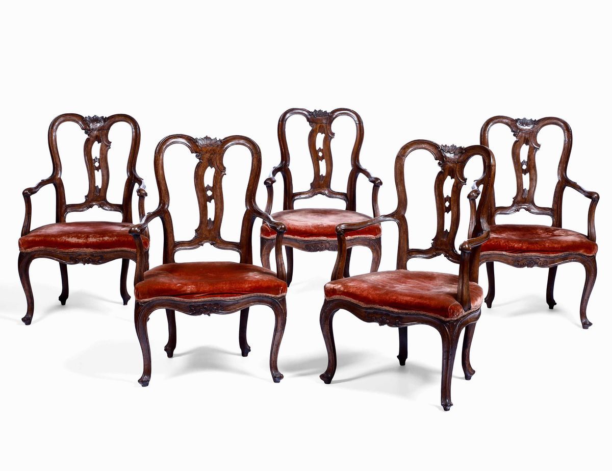 Cinque poltrone in noce intagliato, Venezia XVIII-XIX secolo