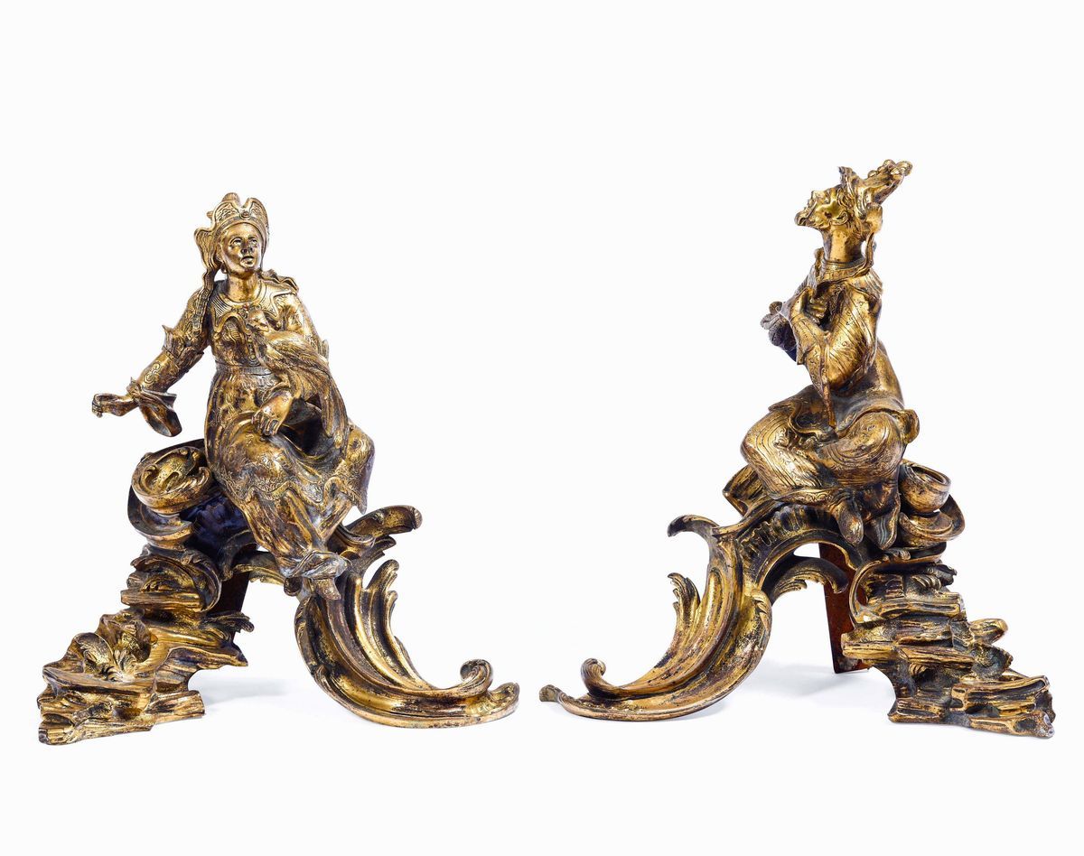 Coppia di alari Bronzo fuso, cesellato e dorato Probabilmente Francia XVIII-XIX secolo