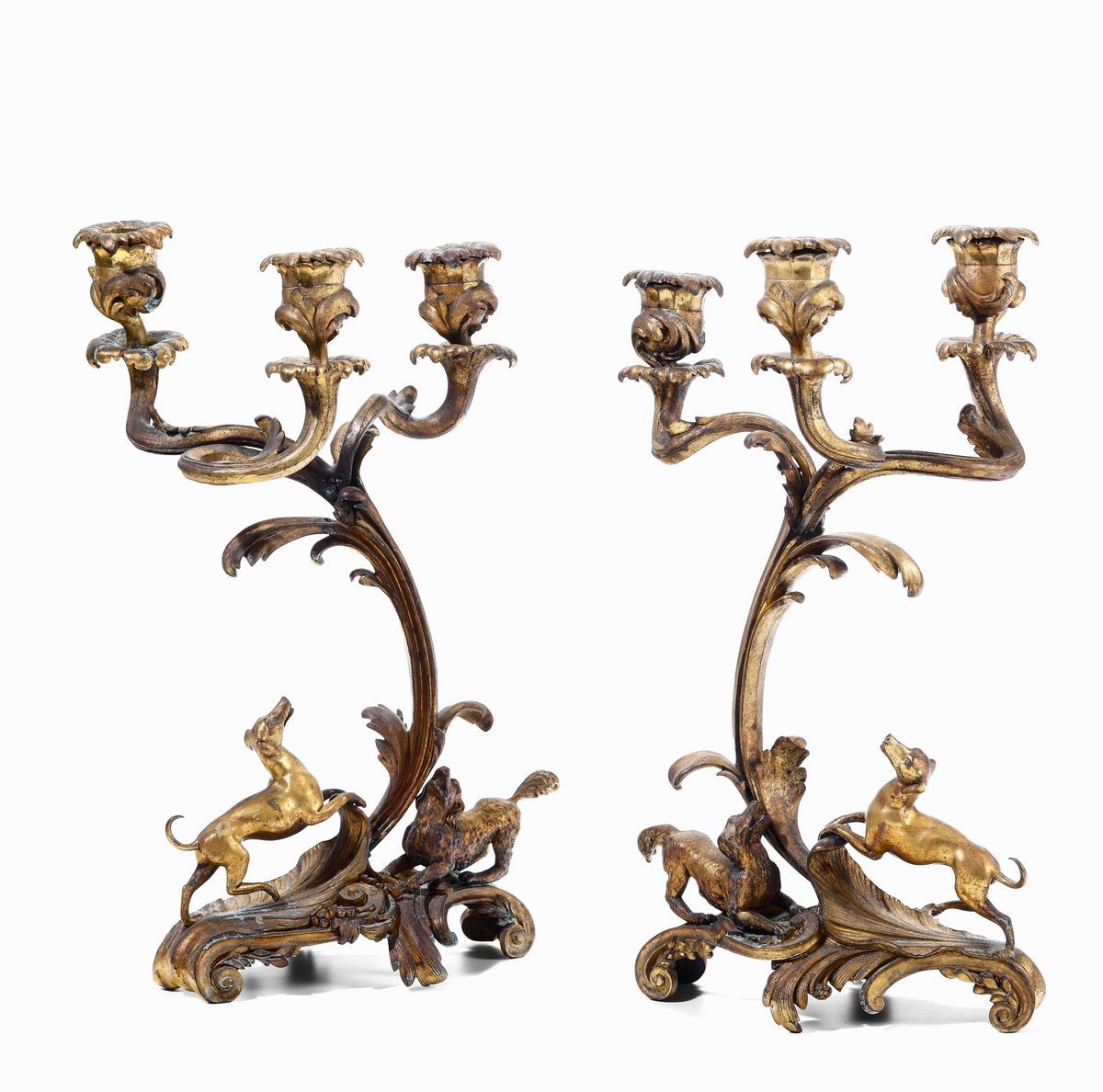 Coppia di candelabri Bronzo fuso, cesellato e dorato Fonditore italiano e francese del XVIII secolo
