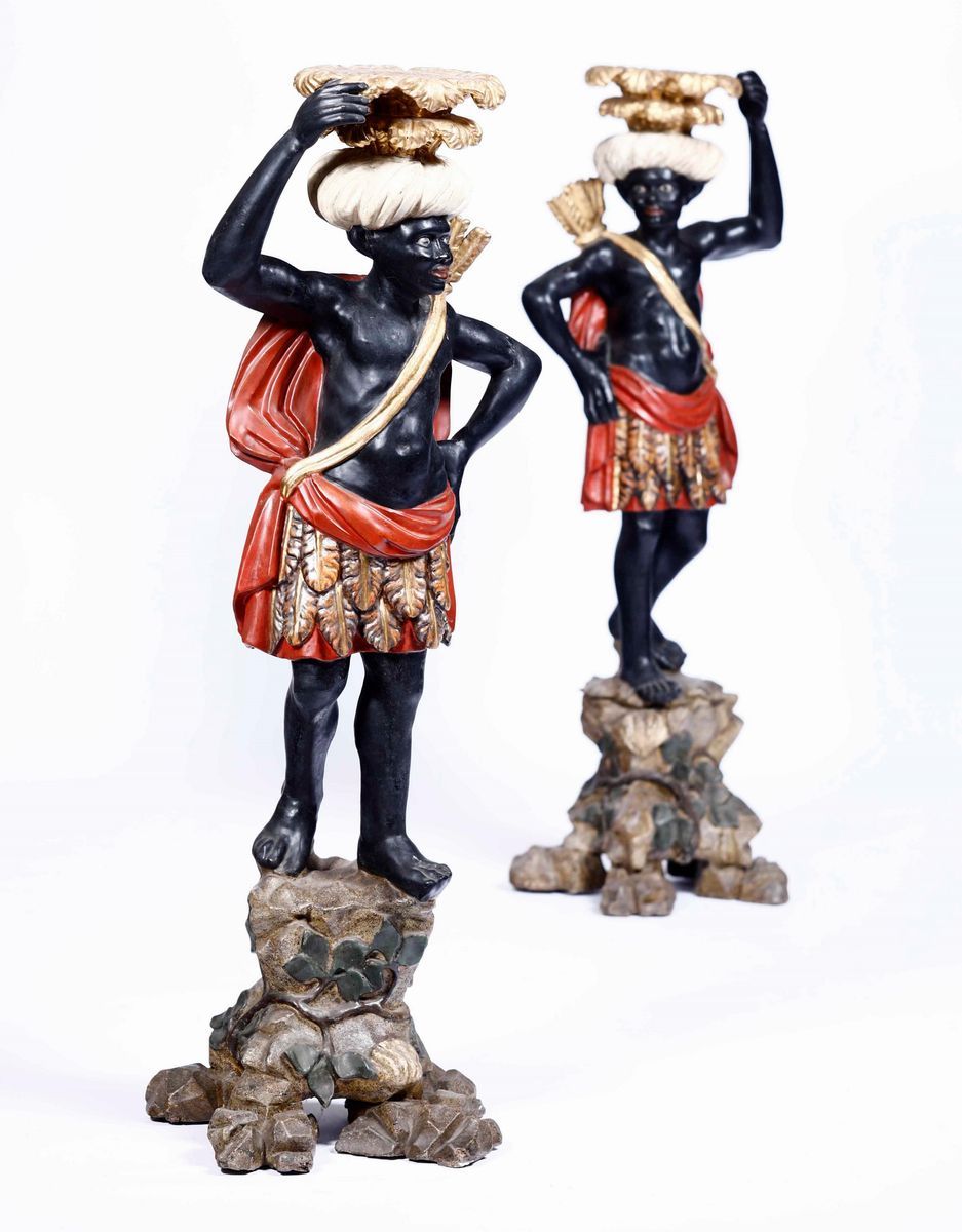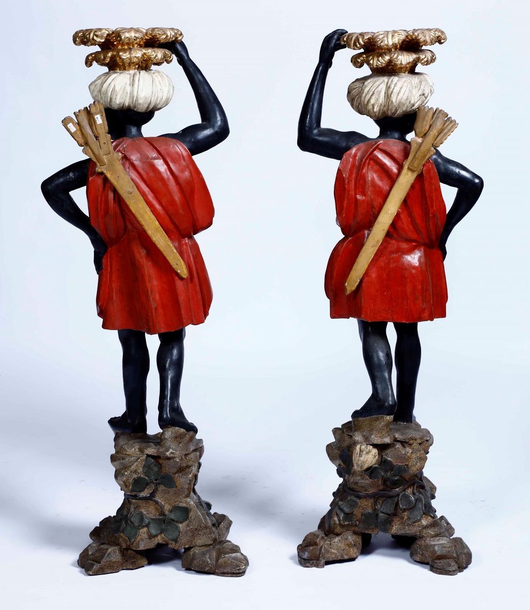 Vivide figure di due giovani mori con mantello, turbante e faretra a tracolla poggianti su una base a rocaille. Aderiscono ai modelli stilistici di gusto esotico del Settecento veneziano ed europeo