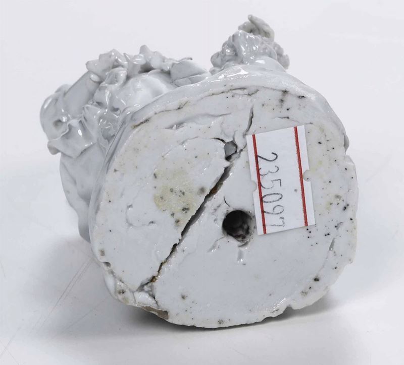Porcellana bianca. Marca: assente. Altezza cm 11,2. Conservazione: due sbeccature alla tesa del cappello; parte del nastro del cappello mancante; insignificanti mancanze alla vegetazione.