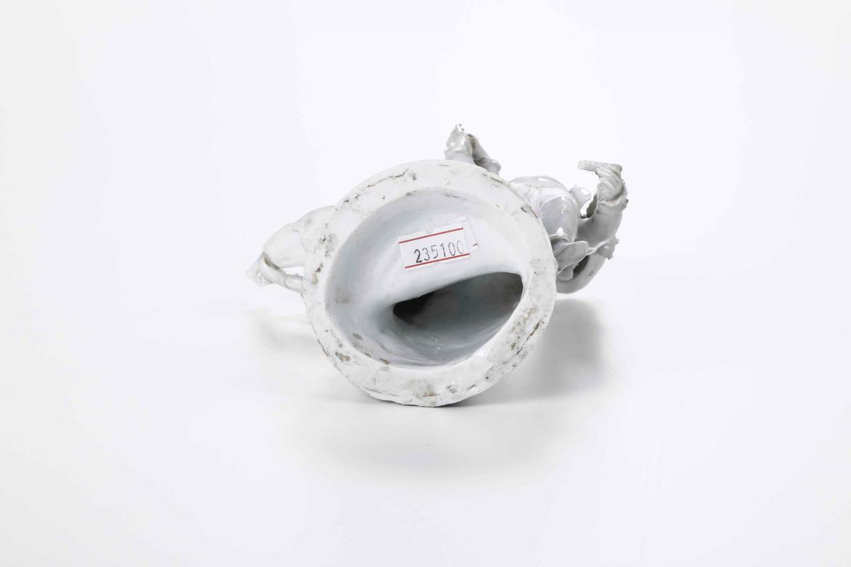 Porcellana bianca. Marca: assente. Altezza cm 14,7. Conservazione: la figura femminile con testa ricomposta in restauro e felatura al polso destro; mano destra della figura maschile ricomposta in restauro; insignificanti mancanze e restauri minori