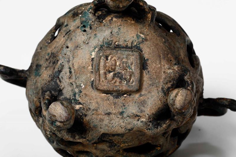 Incensiere tripode in bronzo a doppia ansa, corpo traforato e presa del coperchio a foggia di cane di Pho, Cina