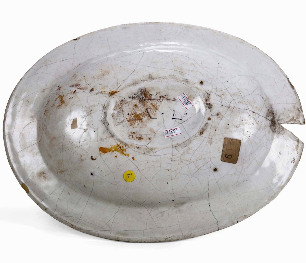Piatto ovale con stretta tesa e centro leggermente umbonato, rivestita di smalto stannifero, decorato con uno stemma bipartito, con la testa di cervo di Sant’Eustachio e testa di moro, con cimiero e cornice in stile compendiario