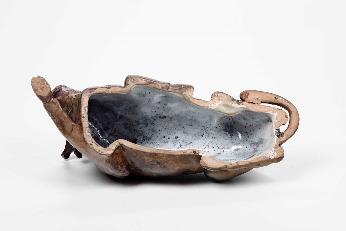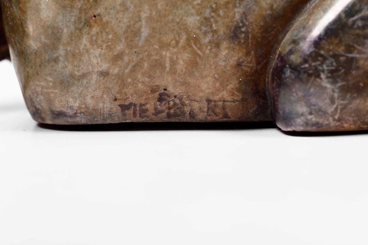 Rara scultura in terracotta maiolicata raffigurante toro sdraiato. Decoro a smalti leggermente lustrati.