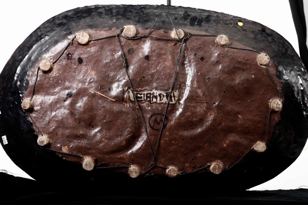 Grande piatto ovale in terracotta maiolicata con scena allegorica a rilievo su fondo in smalto rosso.