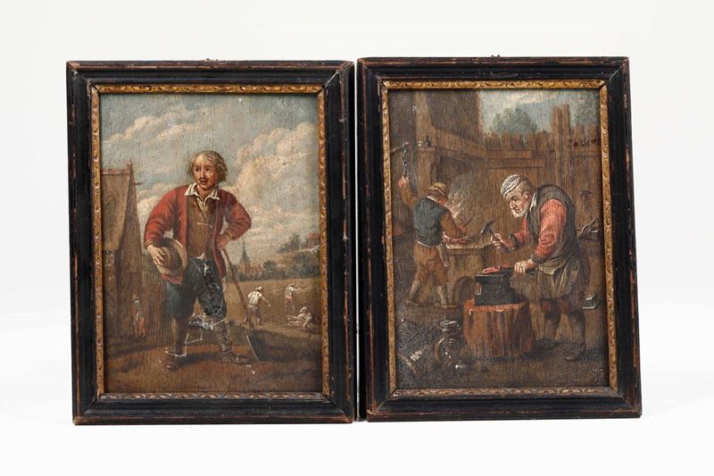 Scuola fiamminga del XVIII secolo Fabbro, contadino, pescatore e cacciatore