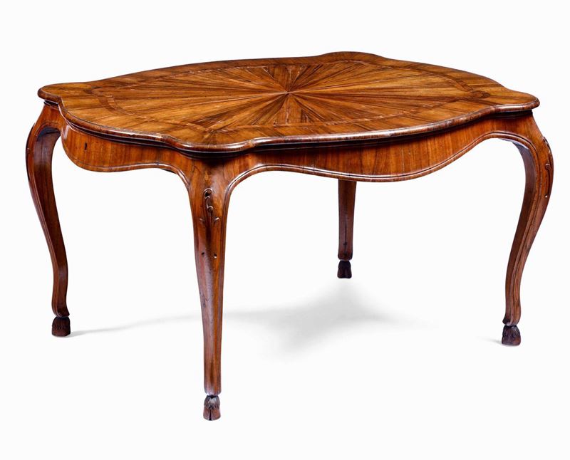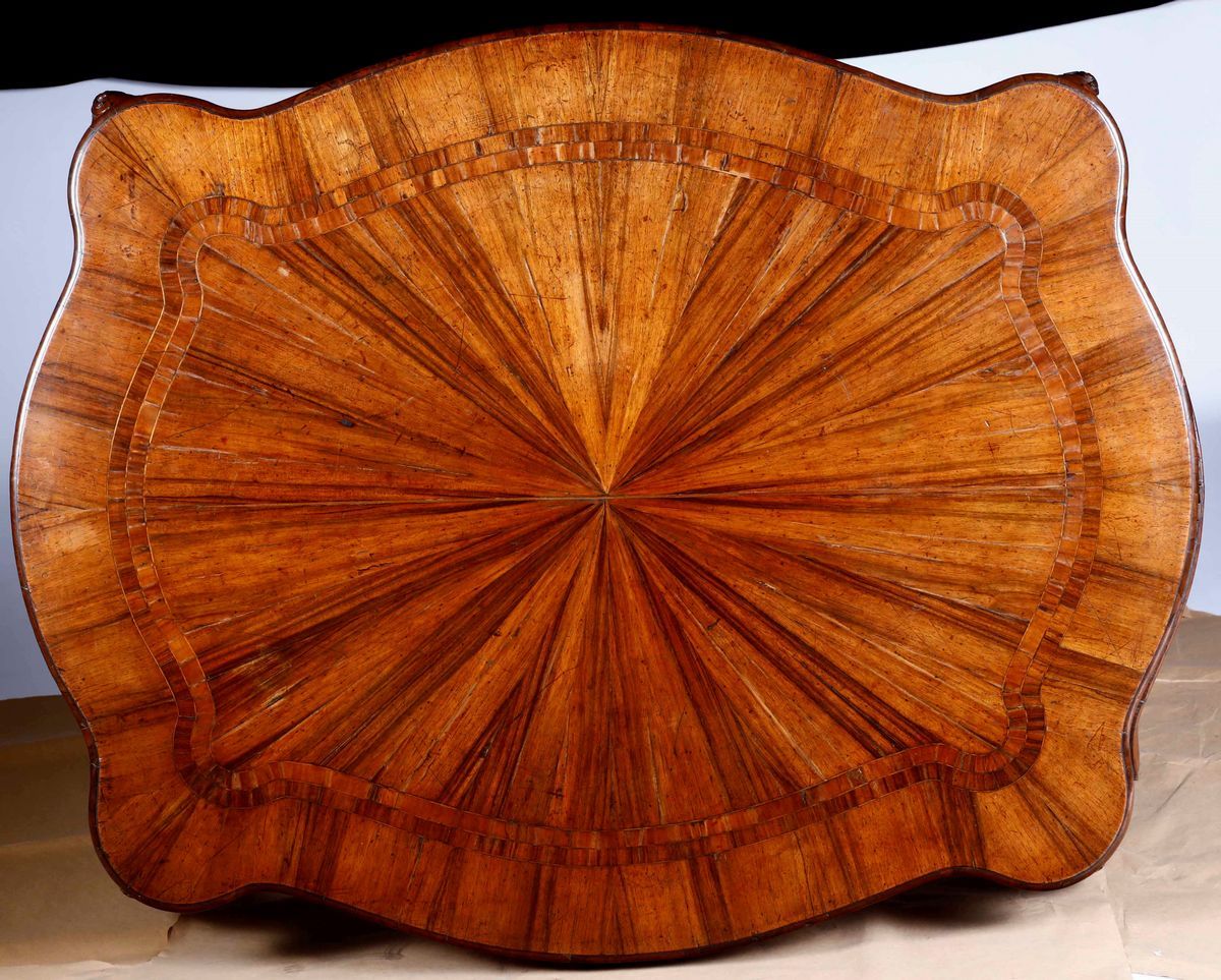 Tavolo impiallacciato in essenza di noce e filettature, Emilia, XIX secolo