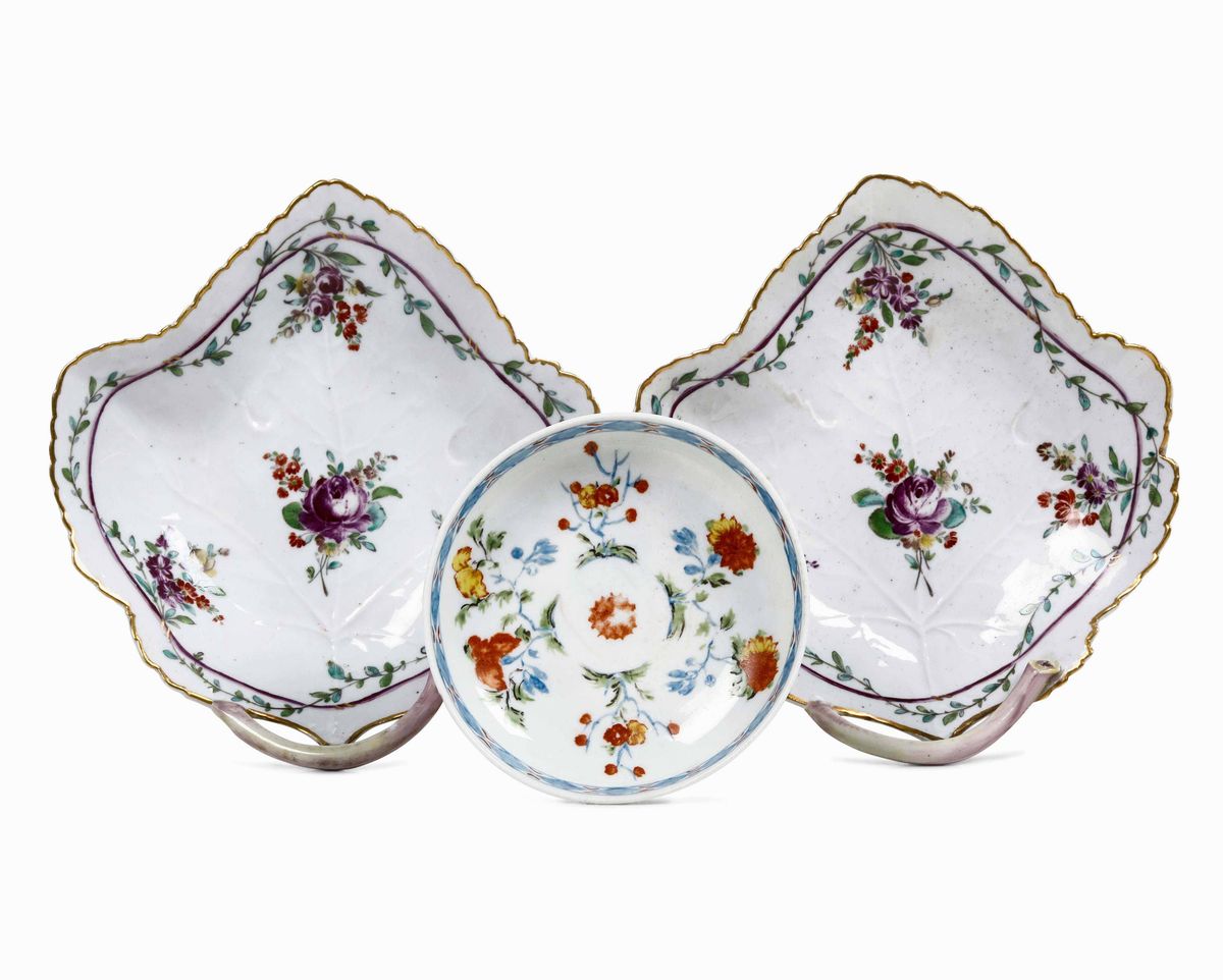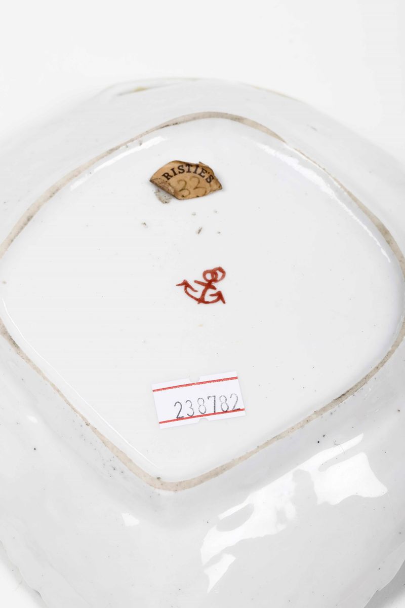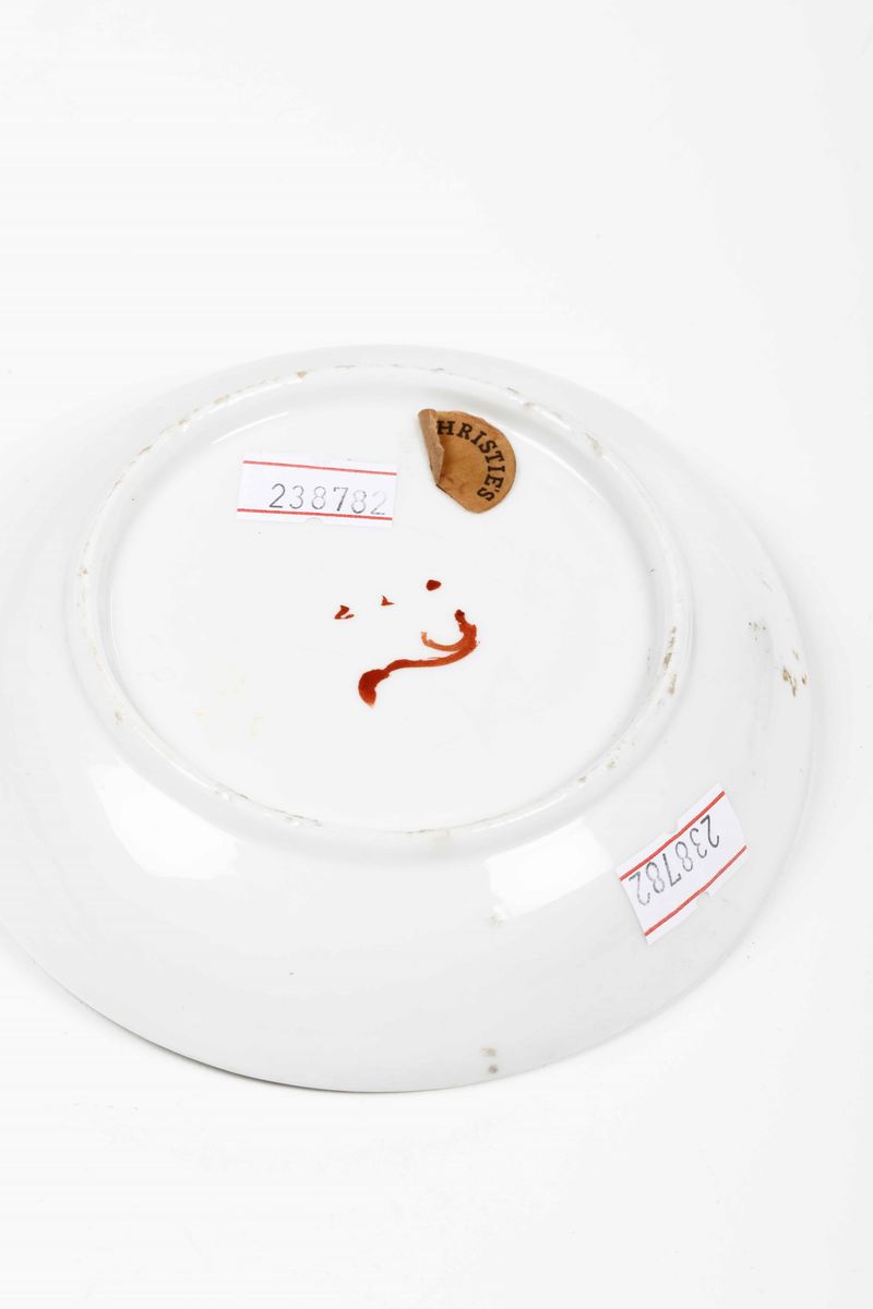 Porcellana. Marca: piattino con simbolo in rosso ferro e “CP” inciso, etichetta cartacea “Christie’s” posta sul verso; 2 vassoietti con ancora in rosso. Dimensioni: diametro cm 12; cm 19x17,7. Conservazione: piattino con felatura a stella passante; vassoietti in ottime condizioni