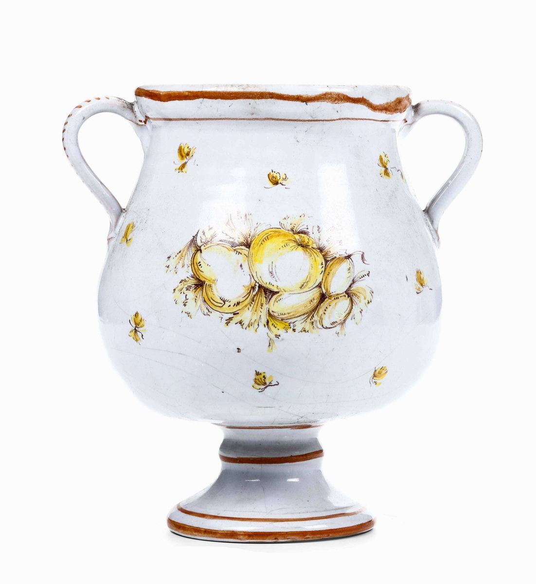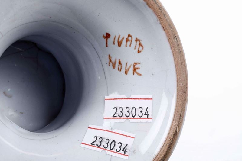 Maiolica. Marca: “Pivato Nove” in arancione. Altezza cm 24. Conservazione: ottima; craquelures