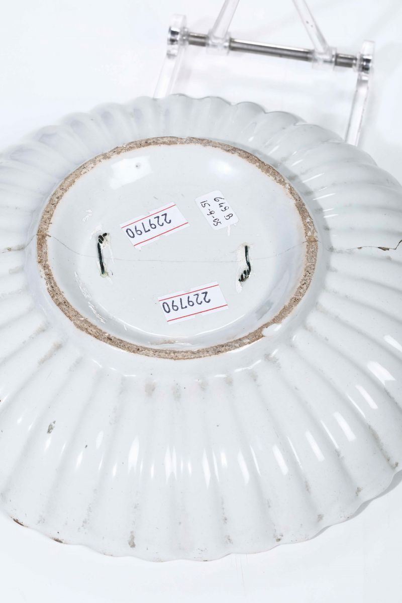 Maiolica decorata in policromia a gran fuoco con il motivo chiamato blanser. Marca: assente. Diametro cm 19,5. Conservazione: 1 piatto rotto in due pezzi ricomposto in vecchio restauro; 1 piatto con felatura