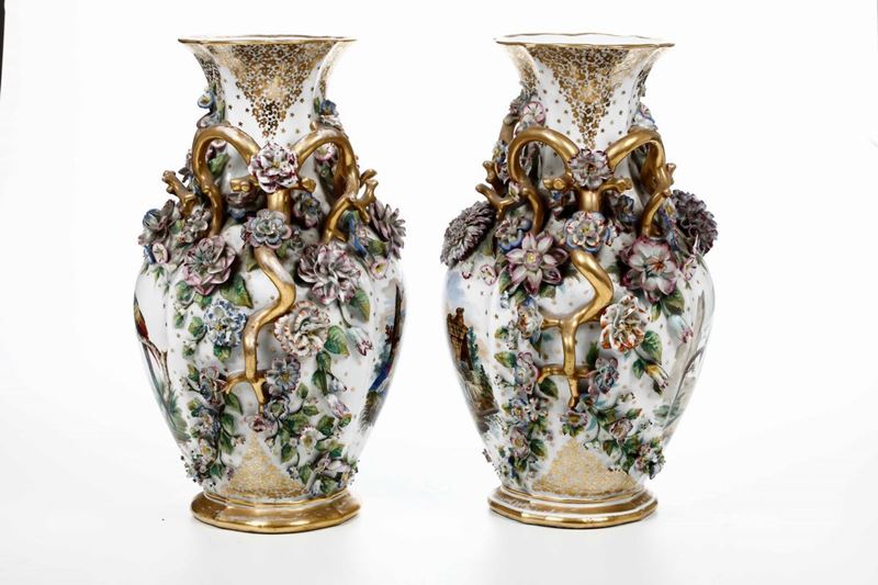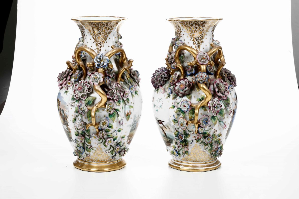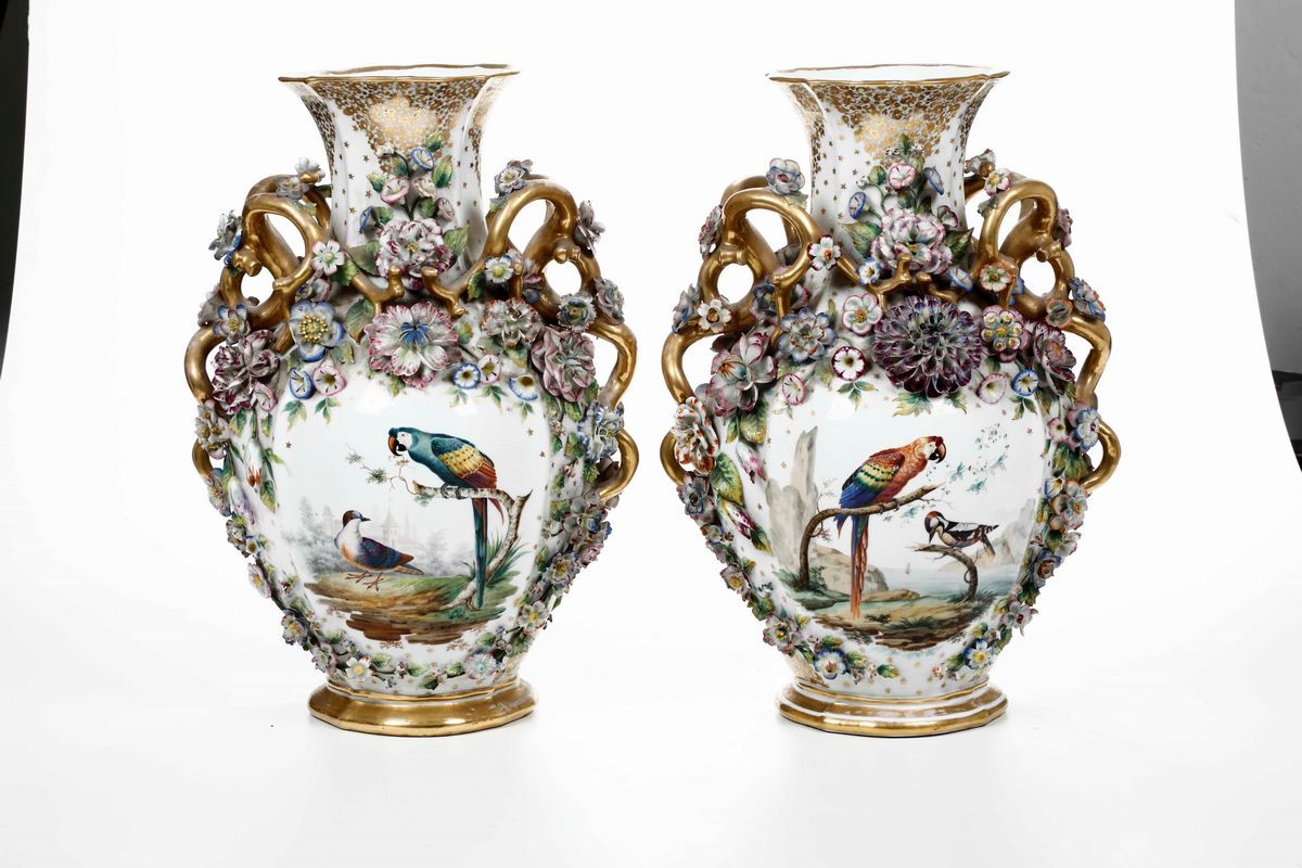 Porcellana decorata in policromia e dorata con scene bucoliche e ornitologiche, incorniciate da rami fioriti a rilievo. Marca: assente. Altezza cm 49. Conservazione: usure all’oro; alcuni petali con rotture e mancanze